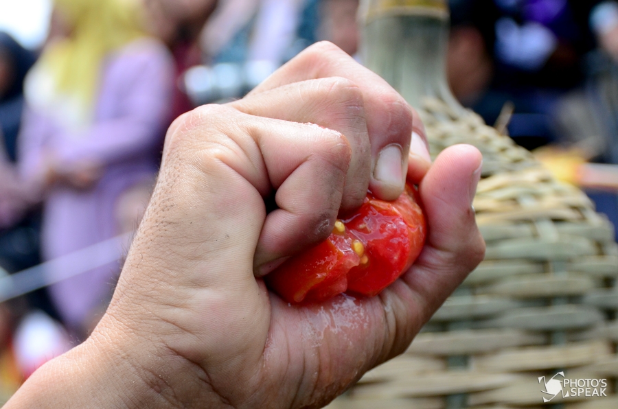 Warga pun bersorak-sorai dan dari mereka yang terkena lemparan tomat kembali melemparkan tomat walau tidak menentu kemana arah tujuan. Perisai yang dipakai perang kini telah beraroma tomat busuk dan jalan pun berubah berubah memerah. Awalnya kedua kubu saling melempar dari jarak jauh, namun waktu demi waktu mereka saling mendekat. Sekitar dua ton tomat afkiran alias tomat yang mulai busuk dan tidak laku dijual itu langsung tandas dalam waktu hampir mencapai 30 menit saja.