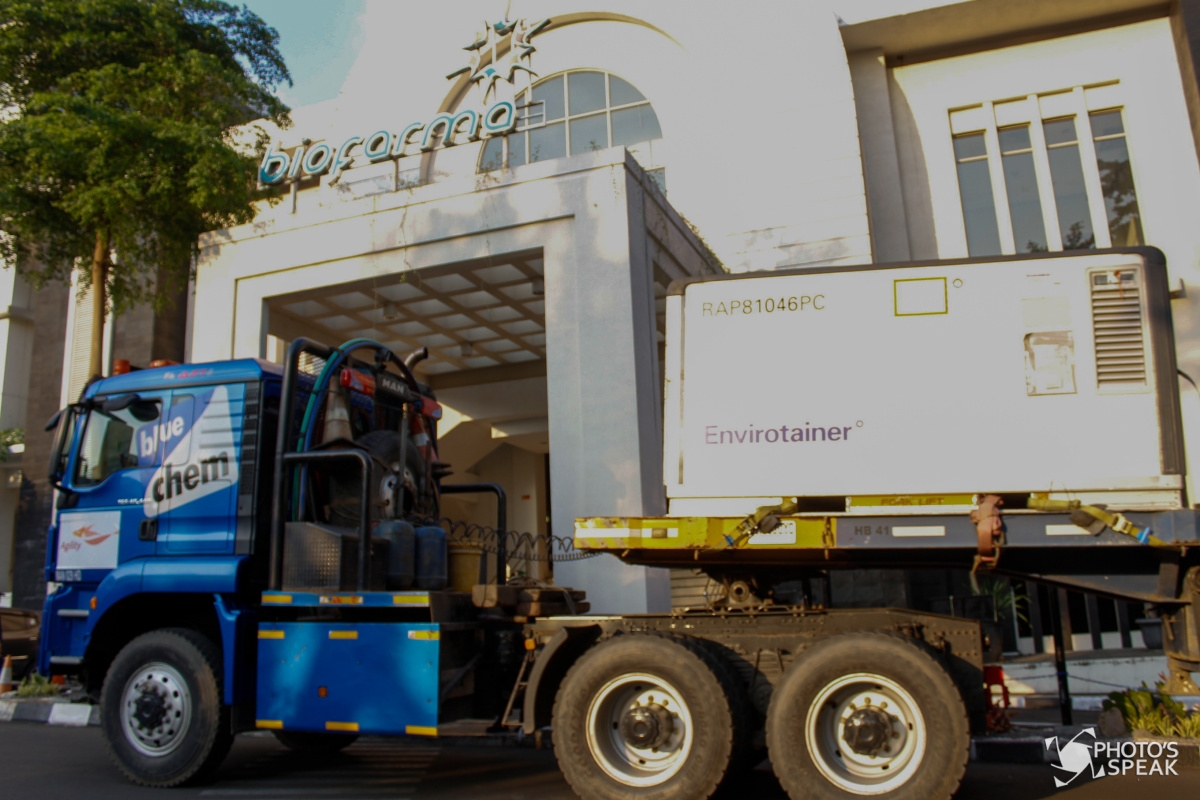 Pekerja melakukan bongkar muat Envirotainer berisi vaksin Covid-19 Sinovac setibanya dari Beijing di Biofarma Bandung, Selasa, (27/7/2021). Sebanyak 21,2 juta dosis vaksin Covid-19 Sinovac dalam bentuk bahan baku atau bulk vaksin kembali tiba di Indonesia yang selanjutnya akan dilakukan uji klinis. PHOTO'S SPEAK / Acep Maulana
