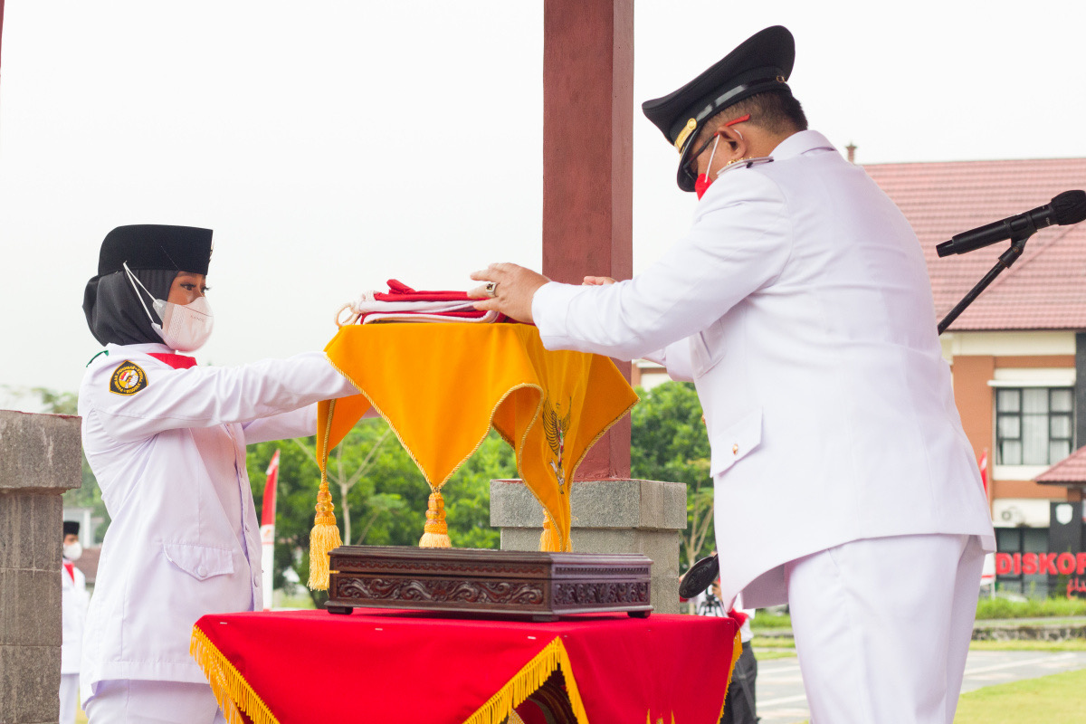 Paskibraka membentangkan bendera Merah Putih saat upacara pengibaran bendera peringatan Kemerdekaan Republik Indonesia di Kantor Bupati Tasikmalaya, Singaparna Kabupaten Tasikmalaya (17/8/2022). Upacara ini dipimpin langsung oleh Bupati H. Ade Sugianto serta dihadiri oleh sejumlah peserta dari Pegawai Negeri Sipil, TNI AU Wiriadinata, Polres dan Marching Band Gita Bahana Praja. PHOTO'S SPEAK / Putra Dimas R
