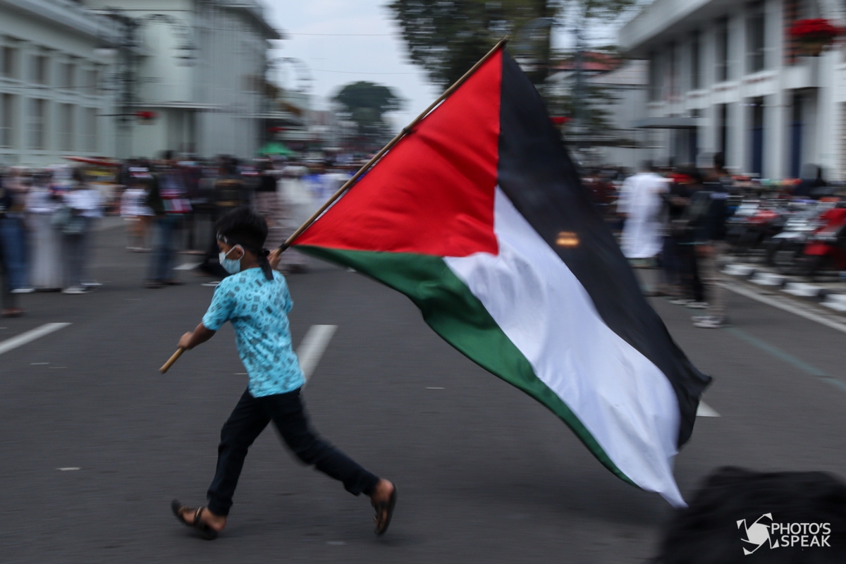 Massa melakukan Aksi Bela Palestina di depan Gedung Merdeka, Kota Bandung, Sabtu (22/5/2021). Ribuan massa yang tergabung dalam masyarakat Jawa Barat peduli Palestina tersebut, melakukan aksi untuk mendukung dan menggalang dana untuk membantu rakyat Palestina yang terdampak akibat serangan Israel. PHOTO'SSPEAK / Choirul Nurahman.