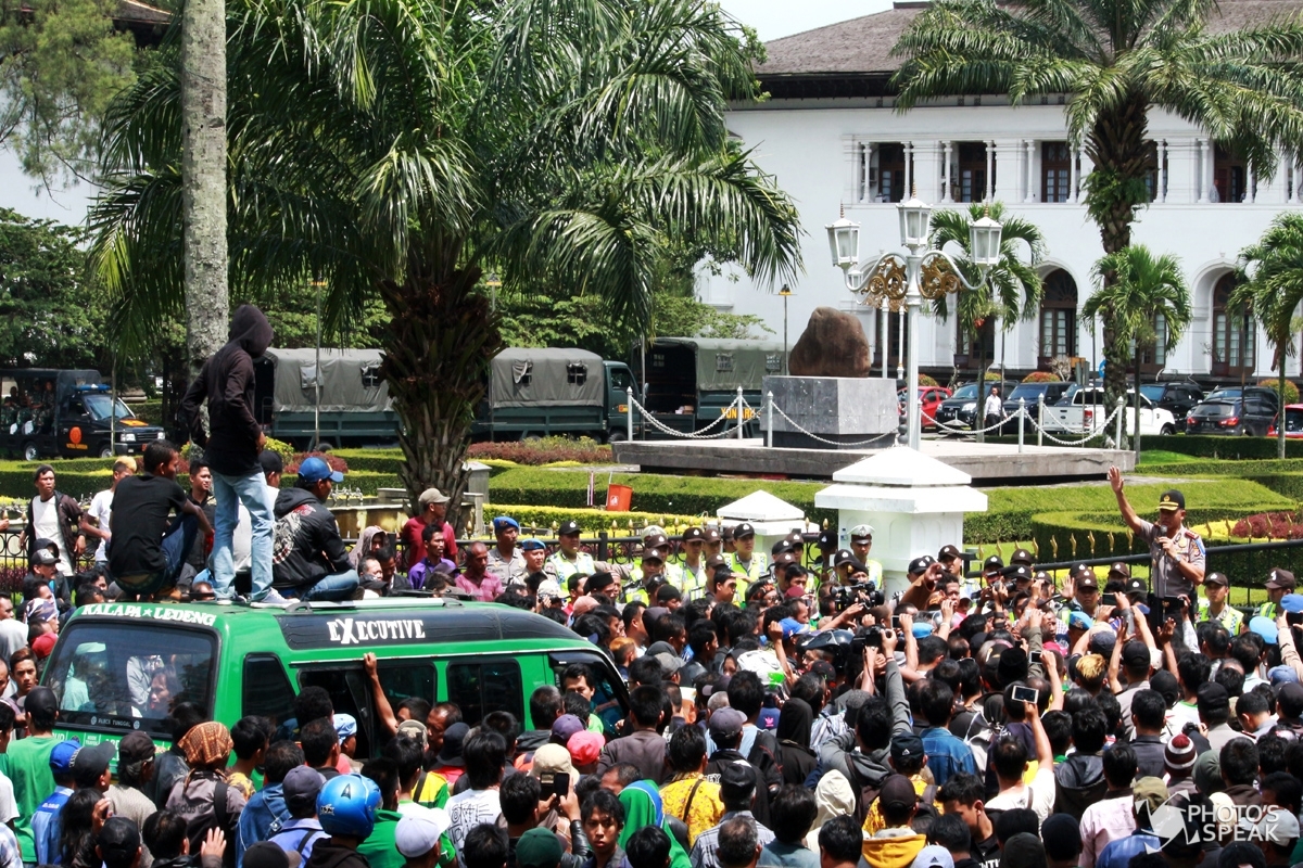 Polisi memberikan arahan kepada sopir angkutan umum yang berdemo di depan Gedung Sate, Jalan Diponegoro, Kota Bandung, Kamis (9/3/2017). Ribuan pendemo yang terdiri dari pengemudi angkot dan taksi konvensional itu, menuntut penolakan Peraturan Menteri Perhubungan Nomor 32 Tahun 2016 tentang taksi online berbasis aplikasi. PHOTOS'SPEAK / Ridha Achmad
