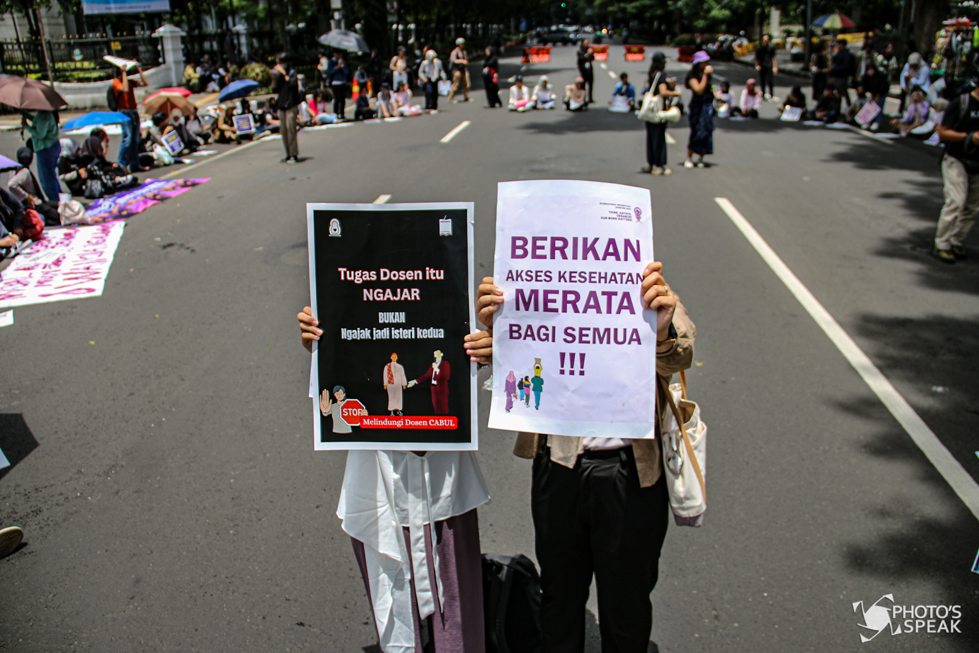 Massa dari Aliansi Simpul Puan memegang poster seruan dalam aksi peringatan Hari Perempuan Internasional 2024 di Jalan Dipenogoro, Kota Bandung, Jum'at (8/3/2024). PHOTOSSPEAK/Rasyad Yahdiyan[/caption] [caption id="attachment_16750" align="alignnone" width="800"]