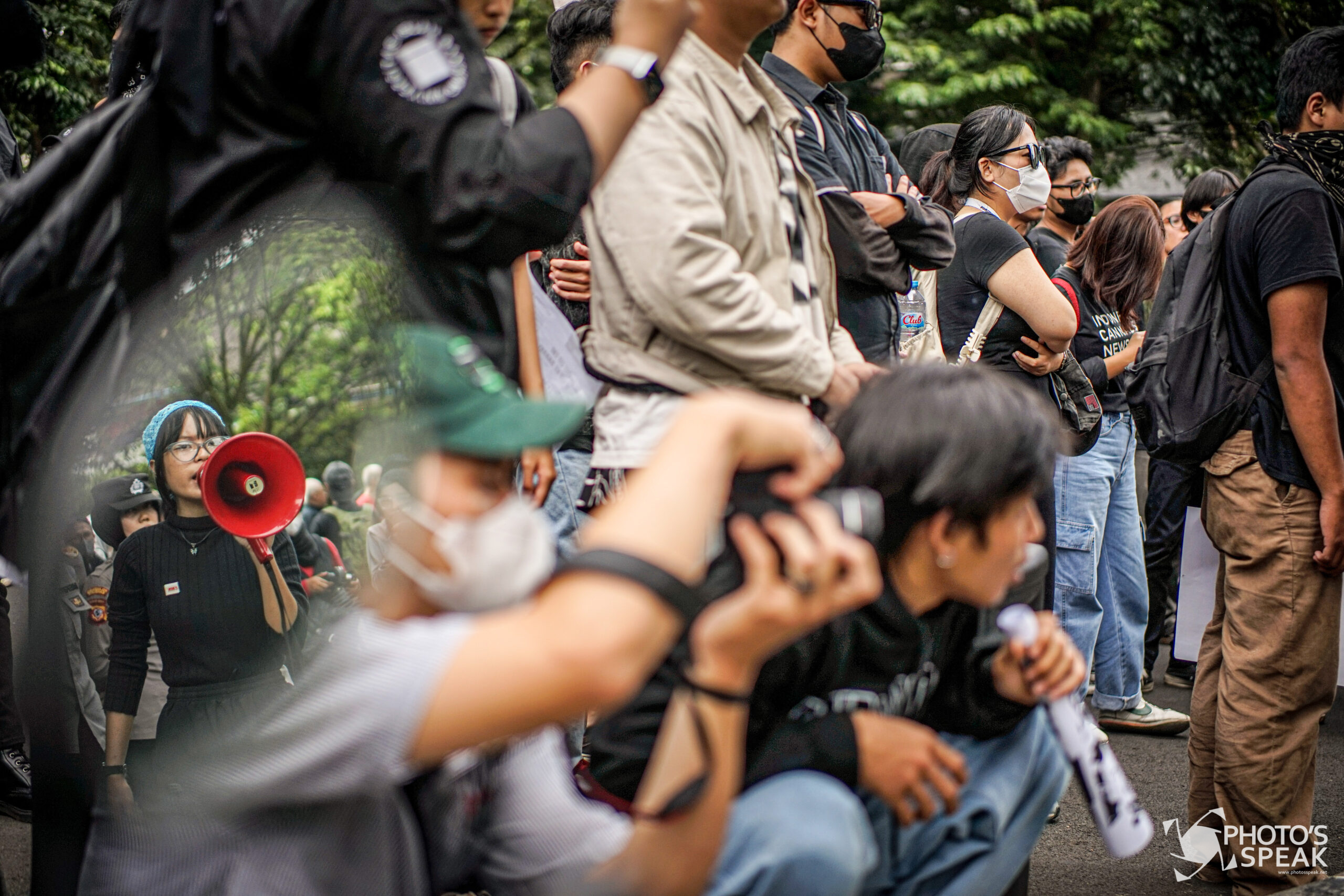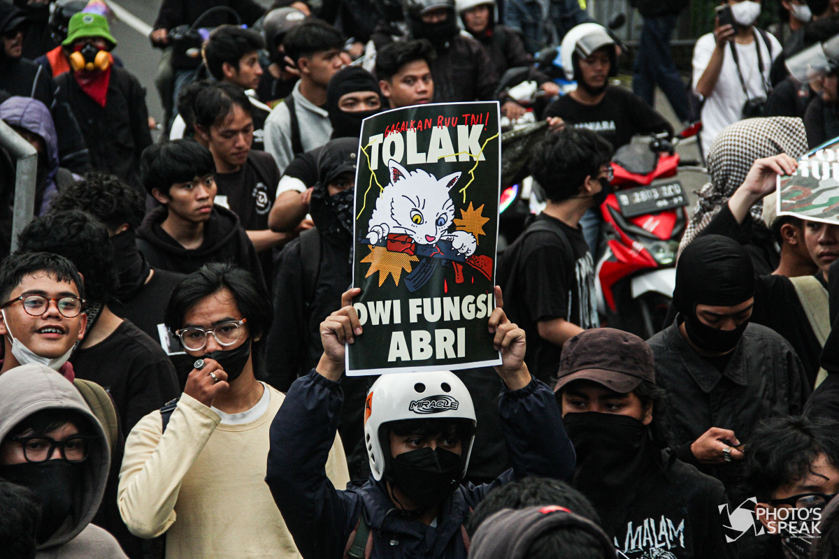 Salah satu masa aksi memegang poster di Jalan Surapati, Kota Bandung, Kamis (20/3/2025). Aksi unjuk rasa yang terdiri dari masyarakat dan mahasiswa tersebut sebagai respon dari banyaknya permasalahan yang muncul di pengesahan Revisi Undang-undang (RUU) Tentara Nasional Indonesia (TNI). PHOTOSSPEAK/Muhammad Tommy Lou.