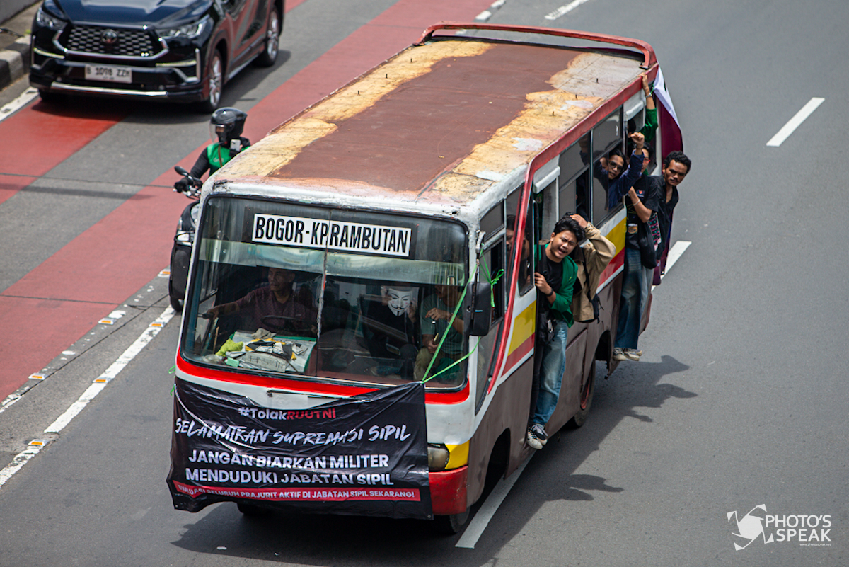 Mahasiswa menggunakan bus untuk memasuki lokasi unjuk rasa di depan kompleks Parlemen, Jakarta, Kamis (20/3/2025). Aksi unjuk rasa yang terdiri dari masyarakat dan mahasiswa tersebut sebagai respon dari banyaknya permasalahan yang muncul di pengesahan Revisi Undang-undang (RUU) Tentara Nasional Indonesia (TNI). PHOTOSSPEAK/Claudio Pramana.