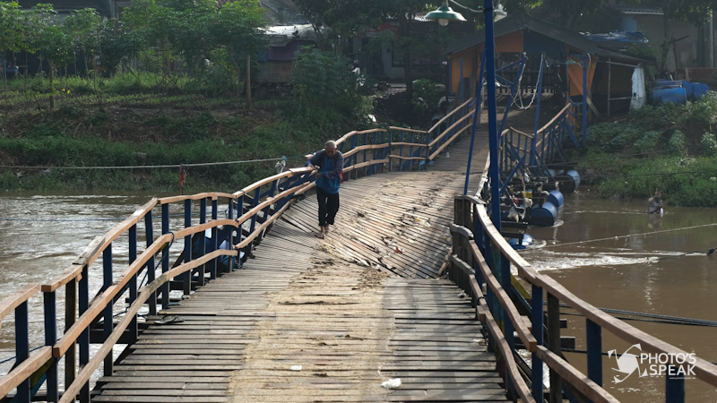 Warga melintasi Jembatan Apung yang menghubungkan Kampung Cijeruk, Bojongsoang, dan Kampung Mekarsari, Baleendah, Kabupaten Bandung, Sabtu (24/5/2025), setelah sebagian jembatan ambruk malam sebelumnya. Peristiwa terjadi saat hujan deras mengguyur, menyebabkan debit Sungai Citarum meningkat dan beban kendaraan tak mampu ditahan, hingga bagian tengah jembatan ambruk dan beberapa sepeda motor jatuh ke sungai. PHOTOSSPEAK/Radhwa Marsya