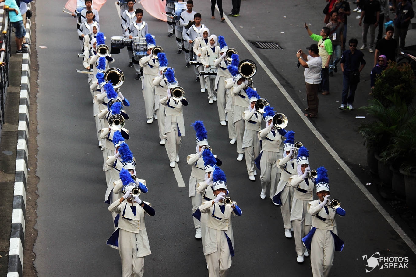Salah satu kelompok peserta lomba parade tampil di hadapan warga pada acara Bandung Marching Band Championship VII di Jalan Merdeka, Kota Bandung, Minggu (06/11/2016). Parade marching band ini diikuti dari seluruh pelajar maupun mahasiswa se-Indonesia yang di gelar di Bandung 5-6 November 2016. Lomba ini merupakan ajang pencarian unit marching band terbaik di Indonesia. PHOTO'S SPEAK/Diki Gumilang