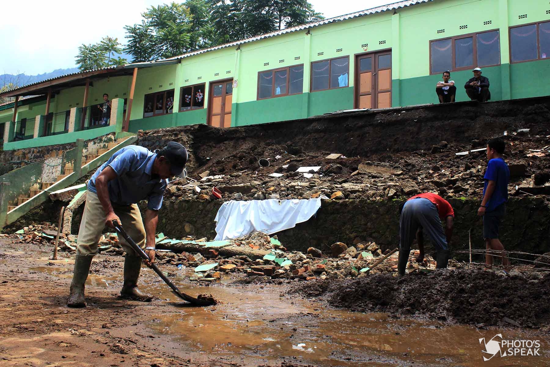 Sejumlah warga membersihkan puing-puing bangunan rubuh di MI Fathul Khaer, Kampung Pasir Angin, Desa Cilengkrang, Kecamatan Cilengkrang, Kabupaten Bandung, Minggu (13/11/2016). Ambruknya bangunan disebabkan curah hujan yang tinggi sehingga debit air naik. Tidak ada korban jiwa tetapi kerugian ditaksir mencapai 30 juta.PHOTO'S SPEAK/Ridha Achmad
