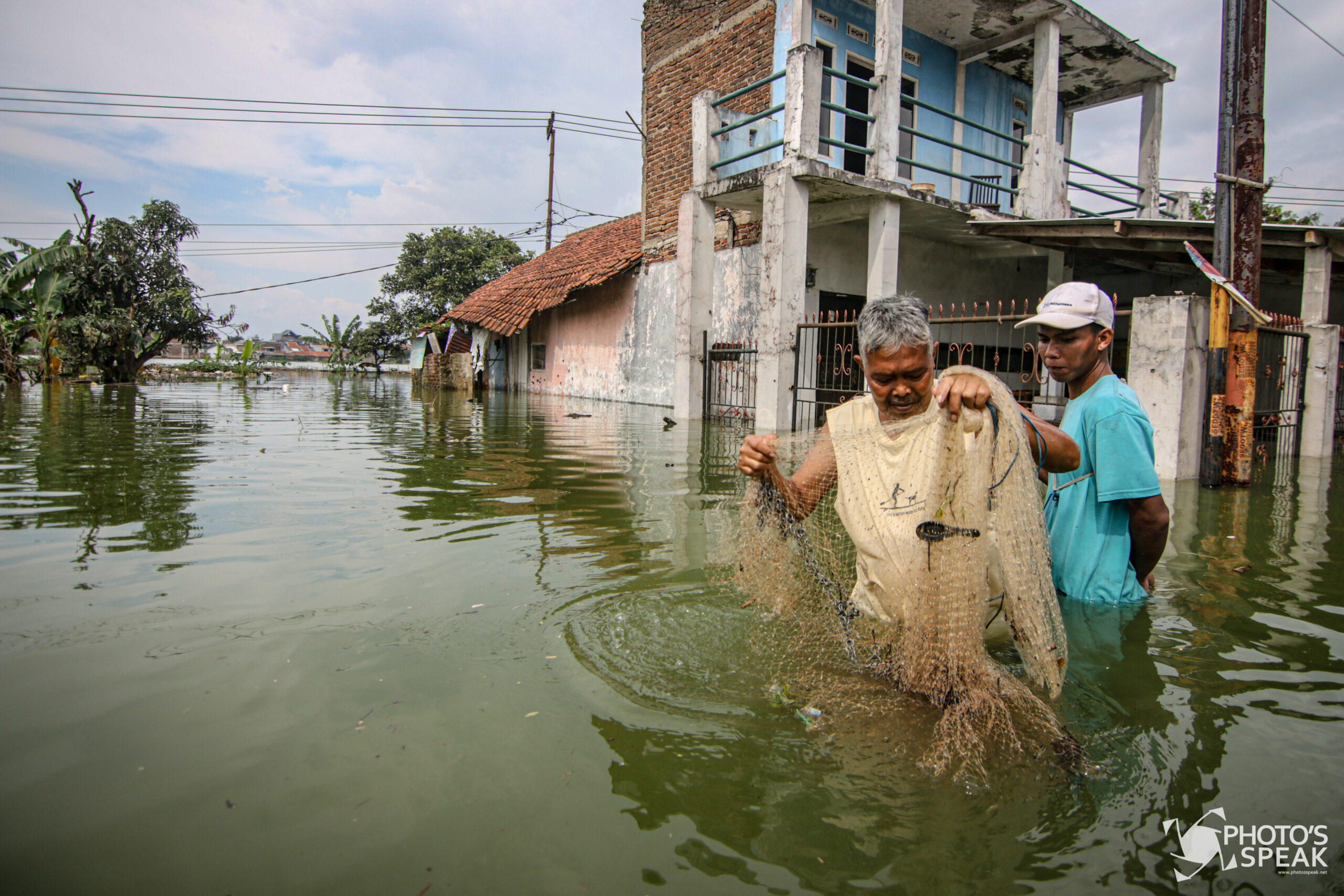 Warga memancing di genangan banjir di Bojongsoang, Kabupaten Bandung, Minggu (9/3/2025). Akibat curah hujan yang tinggi, beberapa wilayah di Kabupaten Bandung salah satunya Kecamatan Dayeuhkolot sejak Jumat malam. Setidaknya sebanyak 483 warga harus mengungsi ke tenda pengungsian, masjid maupun balai rukun warga setempat. PHOTOSSPEAK/Rasyad Yahdiyan.