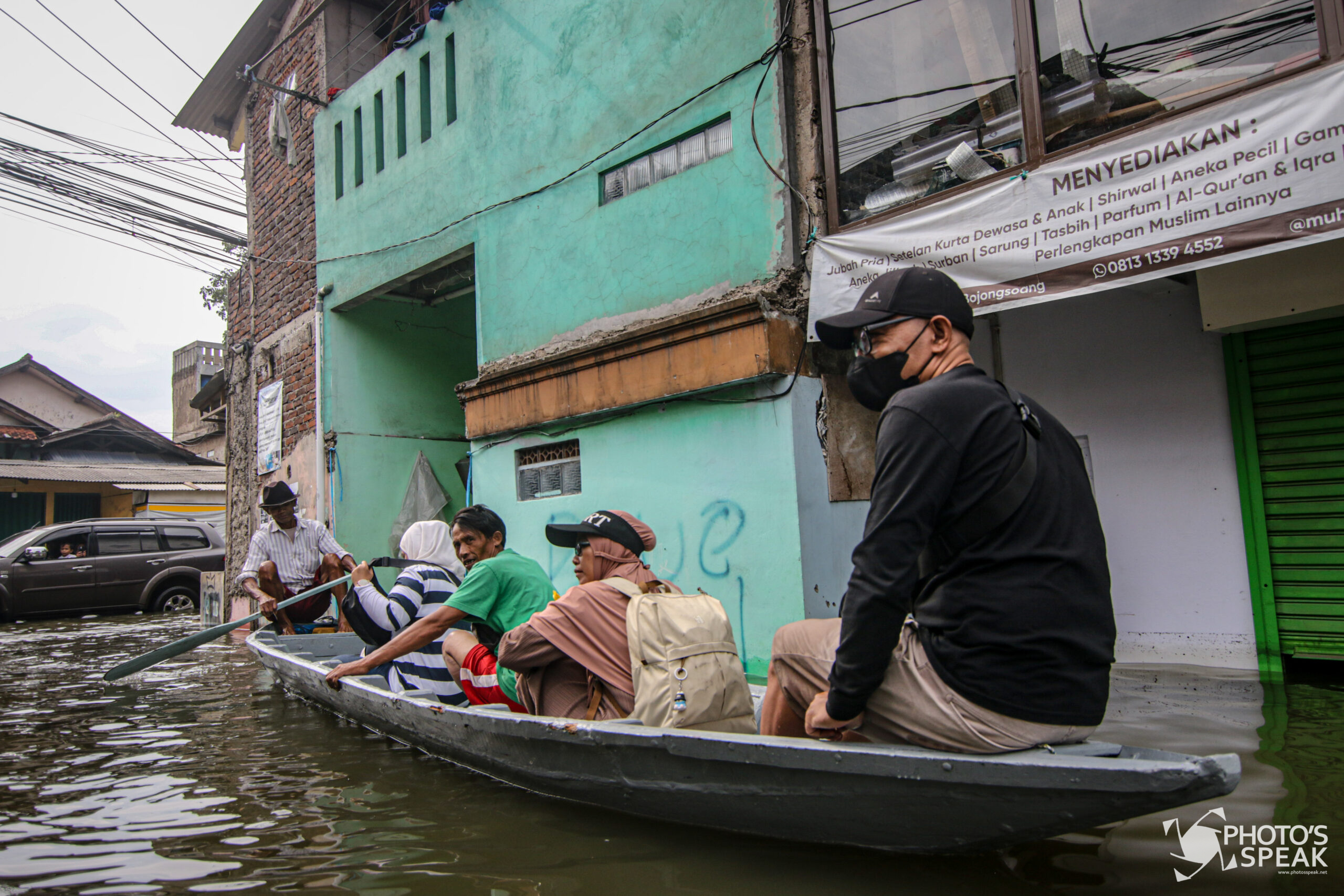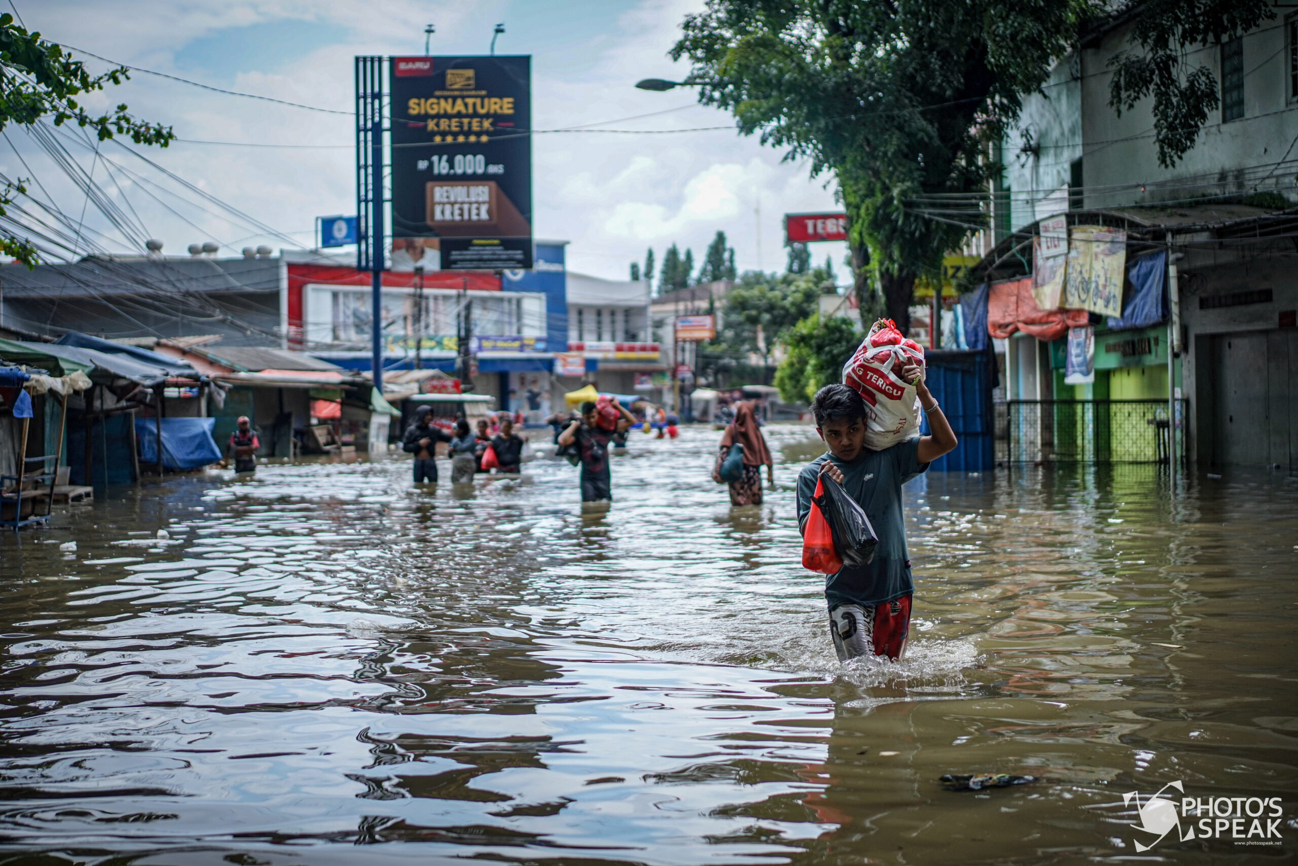 Warga melintasi genangan banjir di Bojongsoang, Kabupaten Bandung, Minggu (9/3/2025). Akibat curah hujan yang tinggi, beberapa wilayah di Kabupaten Bandung salah satunya Kecamatan Dayeuhkolot sejak Jumat malam. Setidaknya sebanyak 483 warga harus mengungsi ke tenda pengungsian, masjid maupun balai rukun warga setempat. PHOTOSSPEAK/Rasyad Yahdiyan.