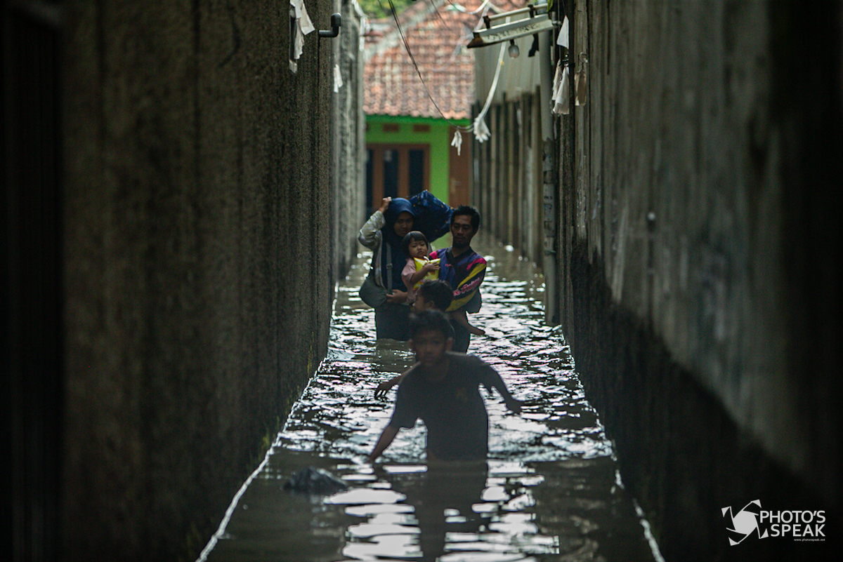 Warga melintasi genangan banjir di Dayeuhkolot, Kabupaten Bandung, Minggu (9/3/2025). Akibat curah hujan yang tinggi, beberapa wilayah di Kabupaten Bandung salah satunya Kecamatan Dayeuhkolot sejak Jumat malam. Setidaknya sebanyak 483 warga harus mengungsi ke tenda pengungsian, masjid maupun balai rukun warga setempat. PHOTOSSPEAK/Rasyad Yahdiyan.