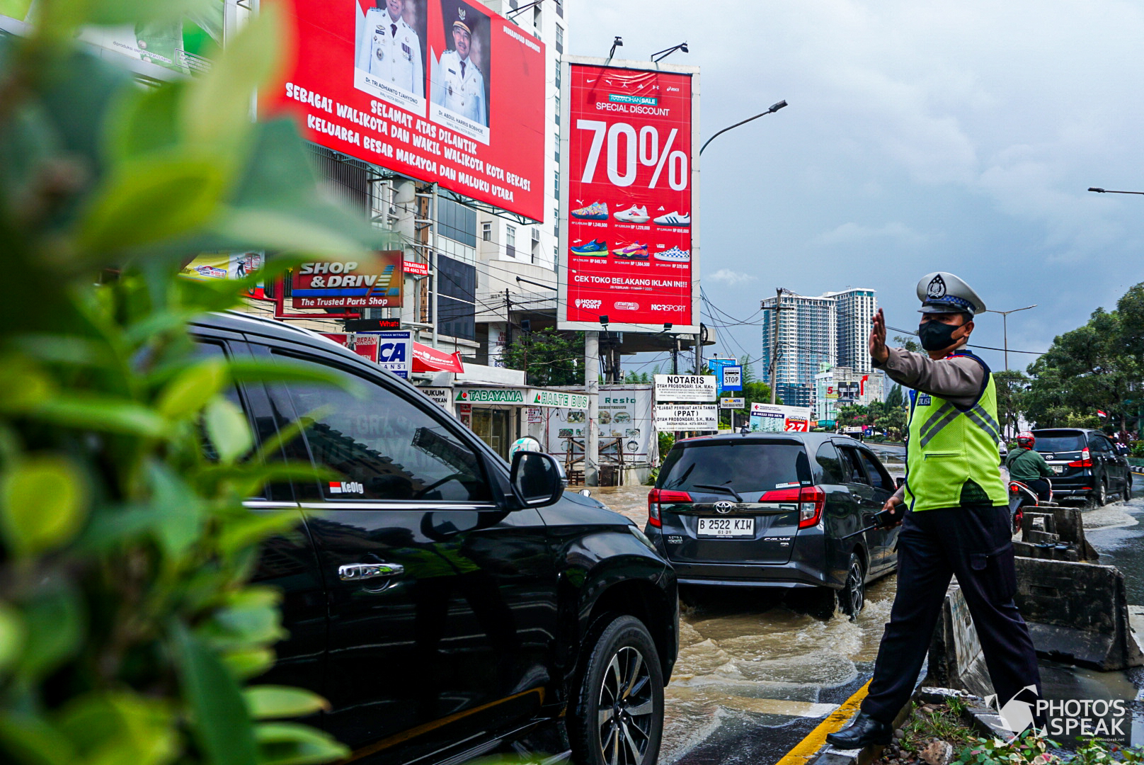 Petugas menyodok lubang drainase yang mampet pada kawasan yang terendam banjir di Jalan Ahmad Yani, Pekayon Jaya, Bekasi, Selasa (4/3/2024). BNPB menyebut penyebab banjir tersebut akibat intensitas hujan yang tinggi dan kiriman air dari Bogor. PhotosSpeak/Muhammad Danendra Ananta Lintang.