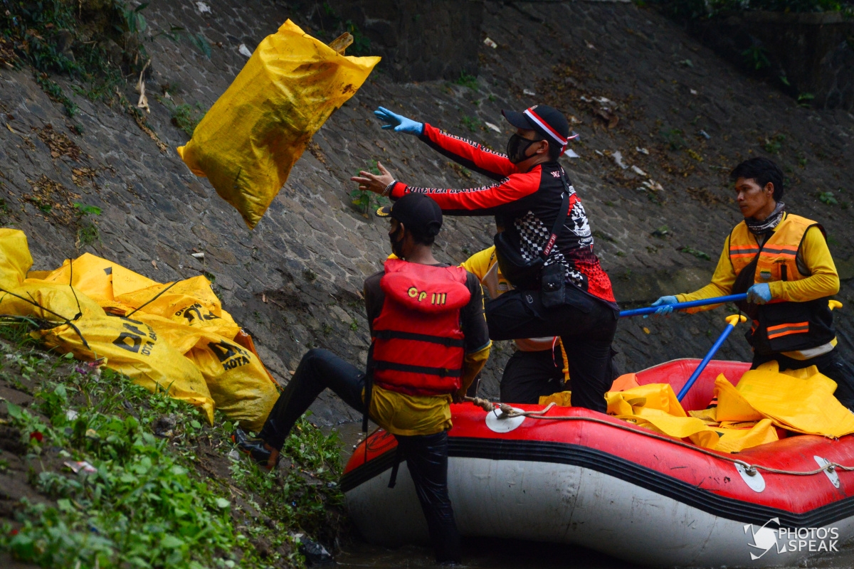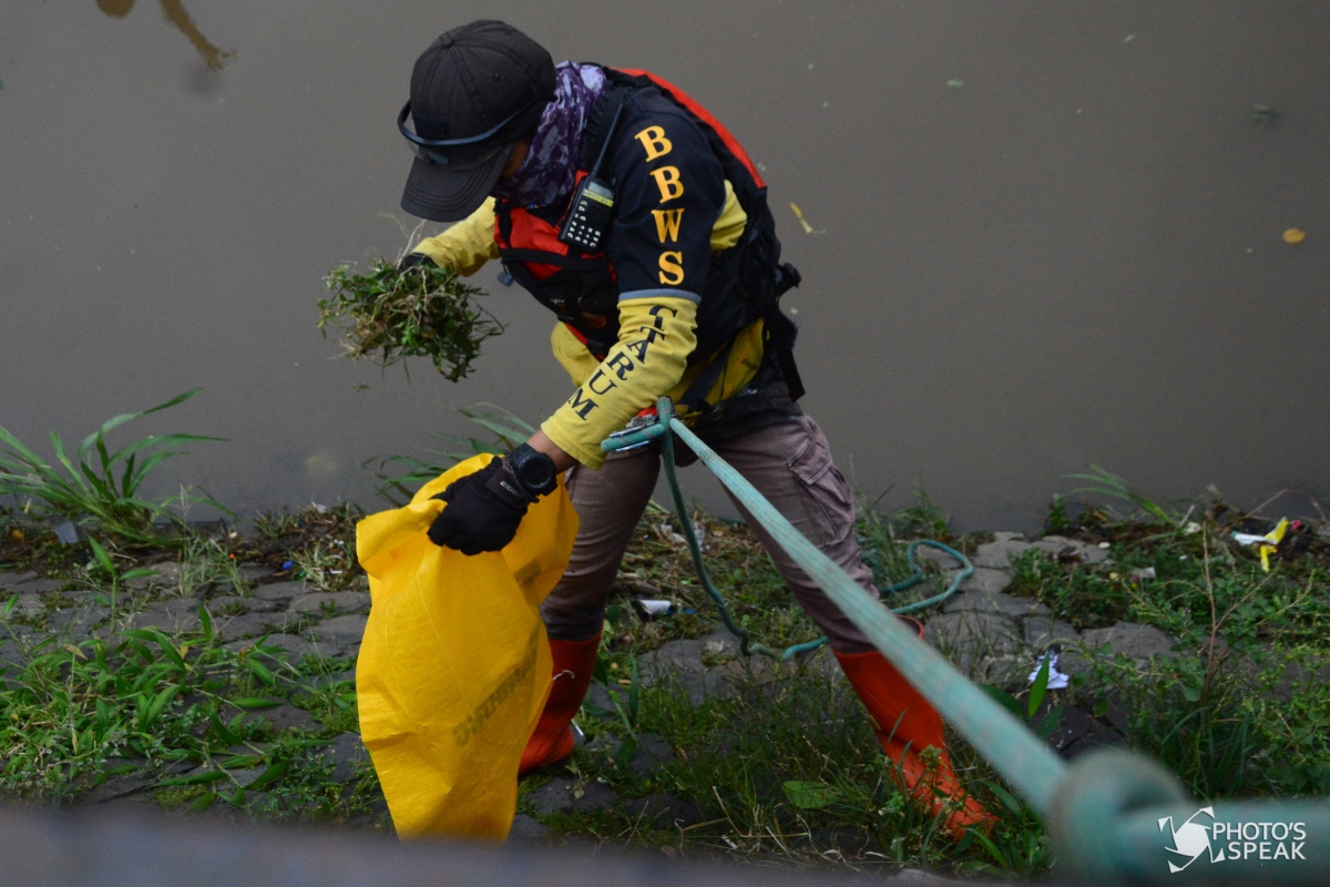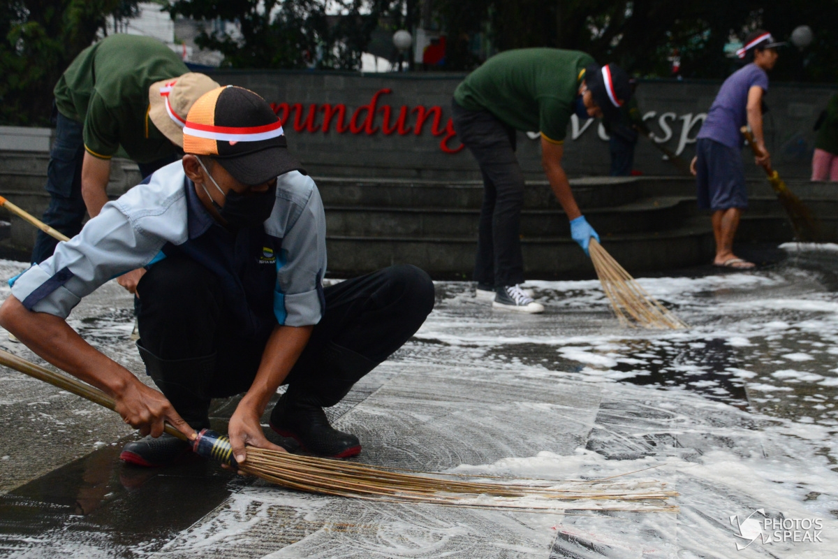 Sejumlah petugas membersihkan Sungai Cikapundung dalam kegiatan Karya Bakti Terpadu Sektor 22, di Cikapundung Riverspot, Jalan Dr. Ir. Soekarno, Kota Bandung, Jum'at (14/8/2020). Kegiatan yang diinisiasi oleh Satgas Sektor 22 Citarum Harum bekerjasama dengan Badan Penanggulanan Bencana Daerah (BPBD), Pemadam Kebakaran (Damkar), komunitas motor dan masyarakat yang bertujuan untuk memelihara taman kota, sekaligus memperingati Hari Kemerdekaan Indonesia ke-75. PHOTO'S SPEAK / Virliya Putricantika