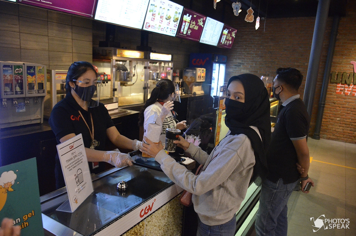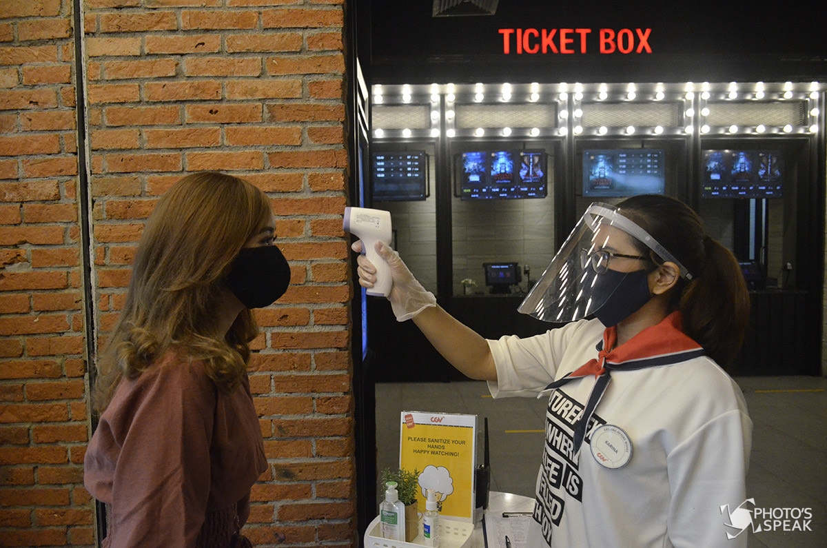 Petugas bioskop mengecek suhu pengunjung di bioskop CGV Bandung Elektronik Center (BEC) di Jalan Purnawarman, Kota Bandung, Senin (12/10/2020). Pemerintah Kota Bandung mengizinkan beroperasinya kembali bioskop di masa AKB (Adaptasi Kebiasaan Baru) ini dengan menerapkan sejumlah protokol COVID-19