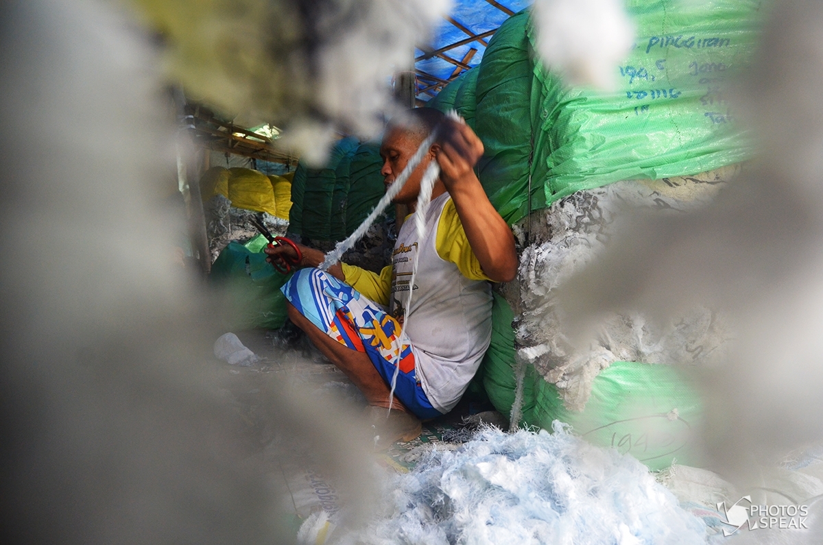 Baban (43) sedang memilah majun layak pakai di Kampung Pamoyanan, Desa Panenjoan, Kecamatan Cicalengka, Kabupaten Bandung, Senin (21/11/2016). Majun yang telah selesai dipilah kemudian akan didaur ulang menjadi benang yang lebih bernilai harganya. Dalam sehari pekerja mampu menyelesaikan 1 ton majun dengan diberi upah Rp600 - Rp1000/kg. PHOTO'S SPEAK/Naufal Azhar Syauqi