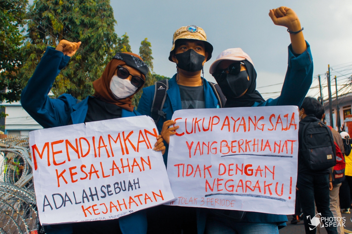 Sejumlah mahasiswa menggelar demonstrasi di Gedung DPRD Kota Tasikmalaya, Simpang Jati, Indihiang, Senin (11/4/2022). Mahasiswa yang tergabung dalam Aliansi Badan Eksekutif Mahasiswa (BEM) Tasikmalaya melakukan aksi secara damai dengan tuntutan menurunkan harga bahan bakar minyak (BBM), menstabilkan harga minyak goreng, serta menolak wacana perpanjangan masa jabatan presiden dan penundaan pemilu. PHOTOSSPEAK/Munifah Nur Saaddah