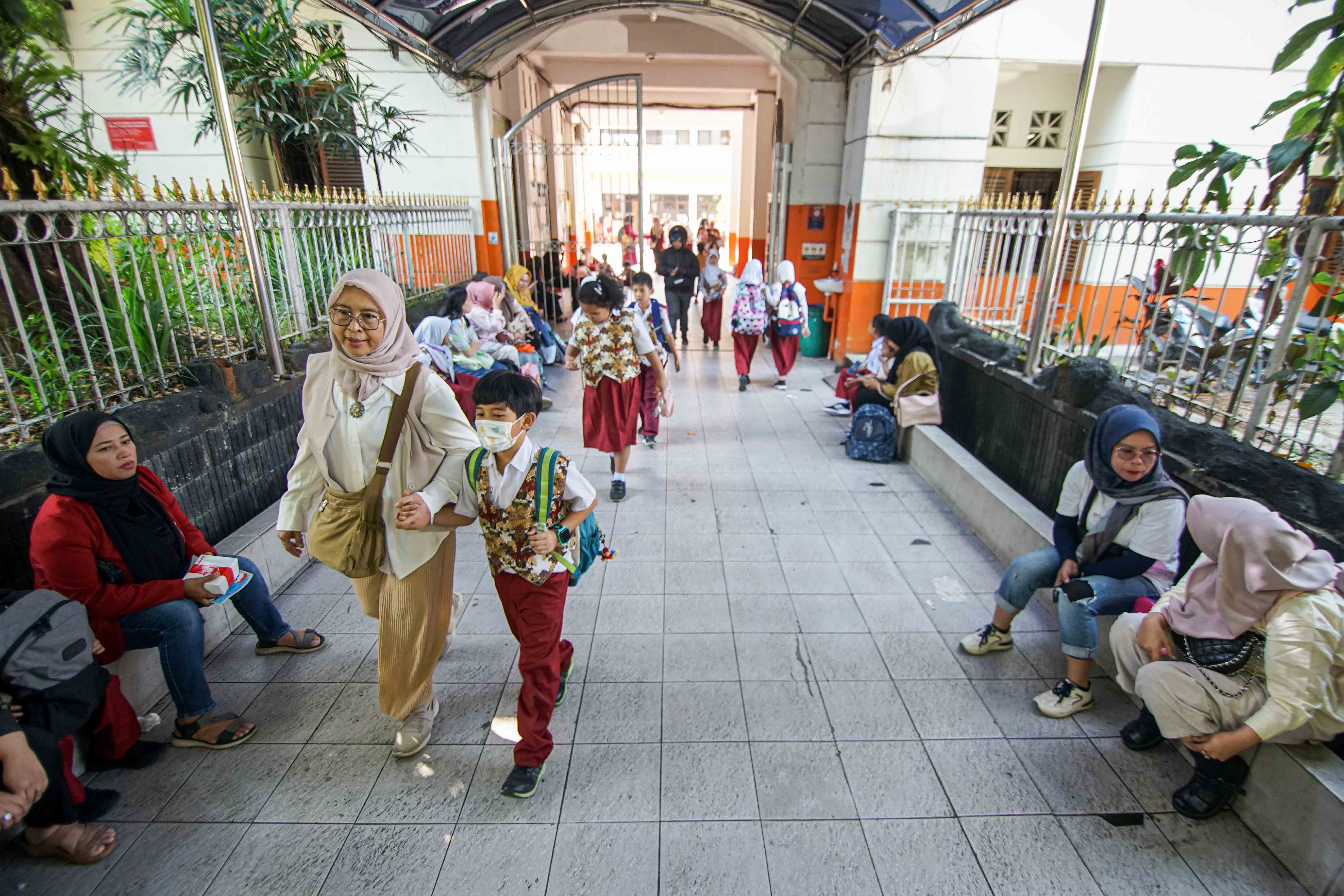 Orangtua siswa menjemput anaknya di SDN 113 Banjarsari, Jalan Merdeka, Kota Bandung, Senin (15/7/2024). PHOTOSSPEAK/Rasyad Yahdiyan