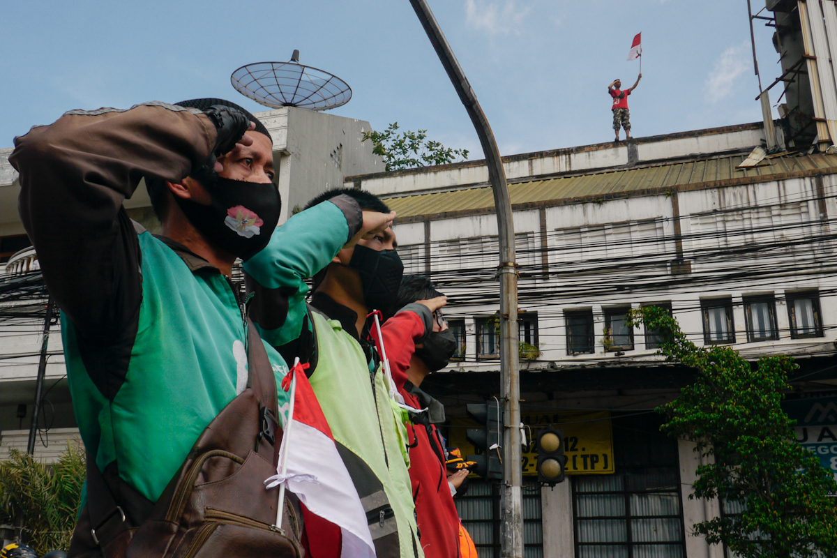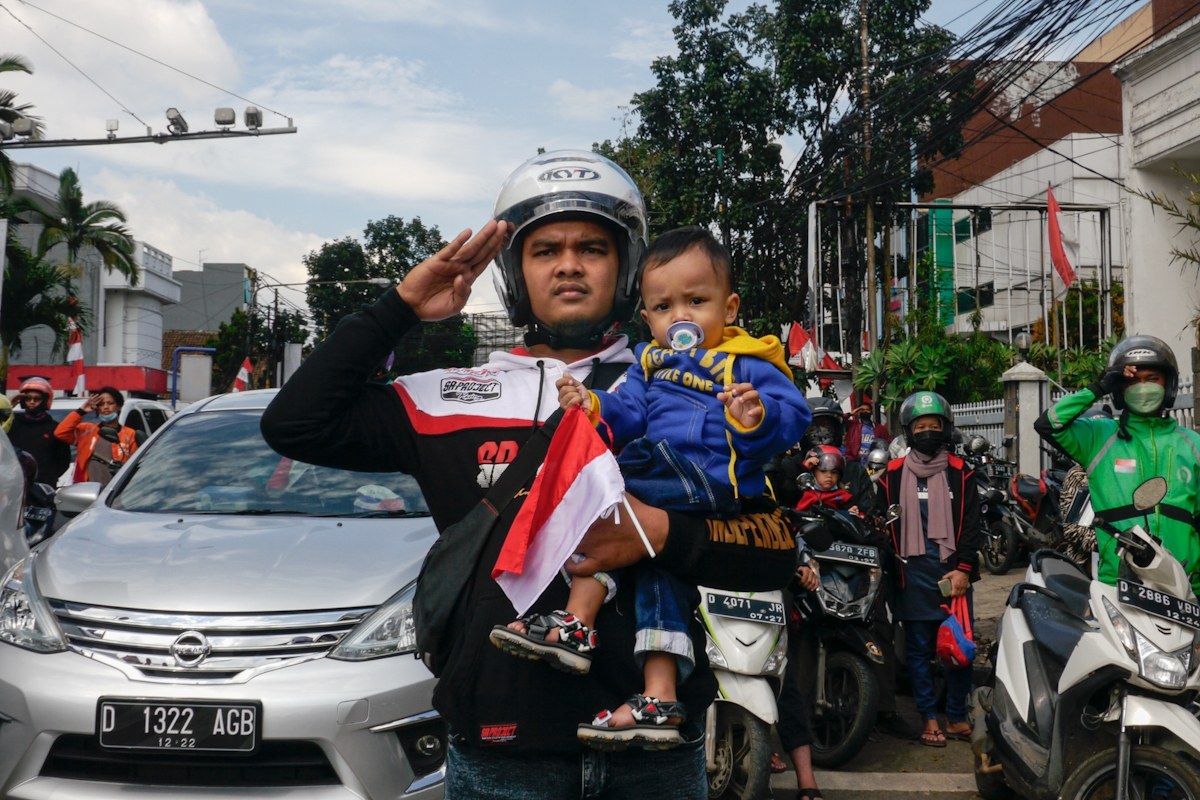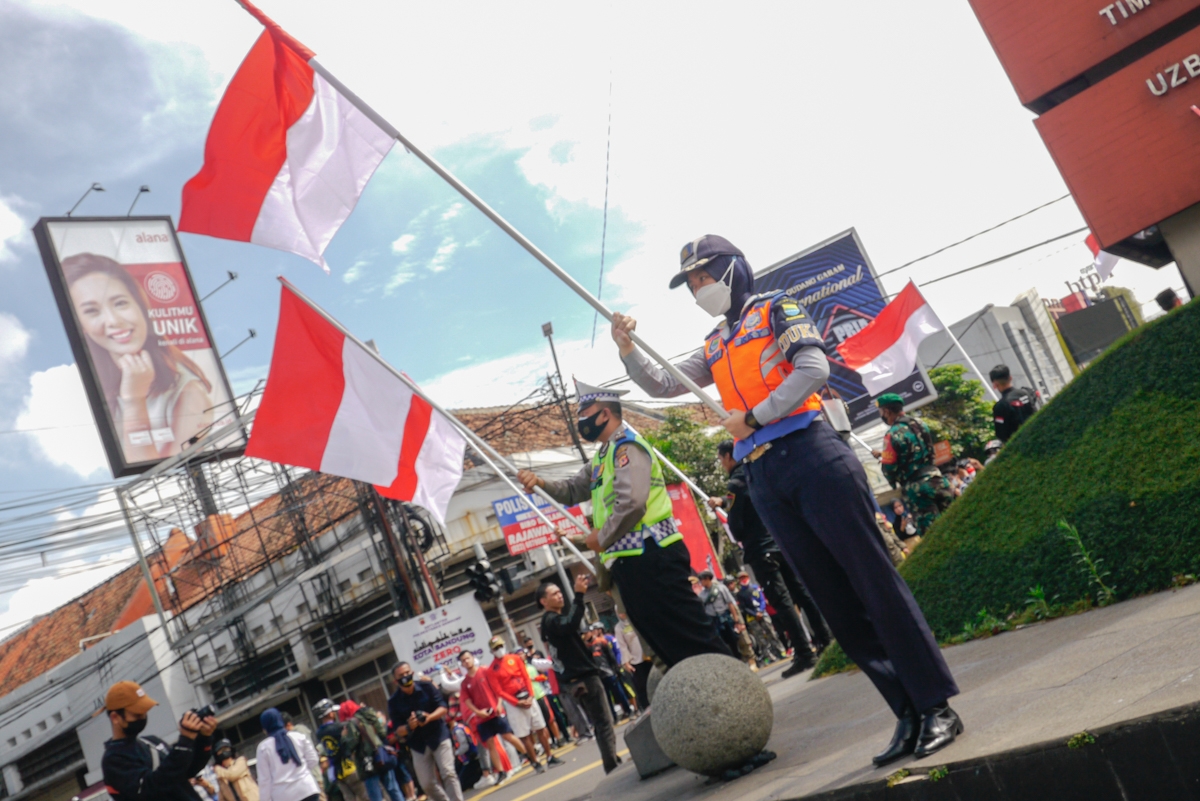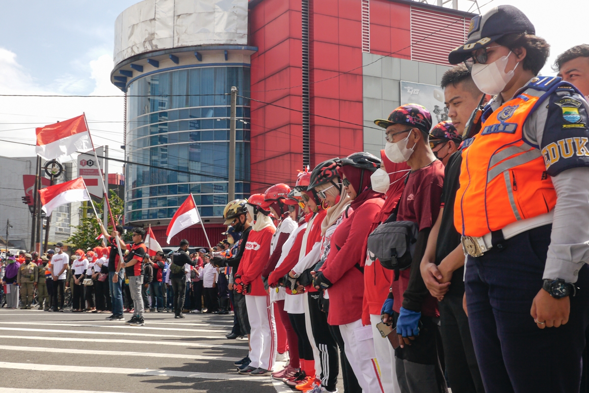 Warga memberi sikap hormat dan mendengarkan lagu Indonesia Raya di kawasan Simpang Lima Asia Afrika, Kota Bandung, Rabu (17/8/2022). Warga dan pengendara yang melewati kawasan tersebut berhenti dan berdiam sejenak selama tiga menit untuk memberi penghormatan kepada Sang Merah Putih pada HUT ke-77 Kemerdekaan Republik Indonesia sebagai bentuk memaknai arti kemerdekaan serta mengengang jasa para pahlawan. PHOTO'S SPEAK / BILAL NUGRAHA GINANJARWarga memberi sikap hormat dan mendengarkan lagu Indonesia Raya di kawasan Simpang Lima Asia Afrika, Kota Bandung, Rabu (17/8/2022). Warga dan pengendara yang melewati kawasan tersebut berhenti dan berdiam sejenak selama tiga menit untuk memberi penghormatan kepada Sang Merah Putih pada HUT ke-77 Kemerdekaan Republik Indonesia sebagai bentuk memaknai arti kemerdekaan serta mengengang jasa para pahlawan. PHOTO'S SPEAK / BILAL NUGRAHA GINANJAR