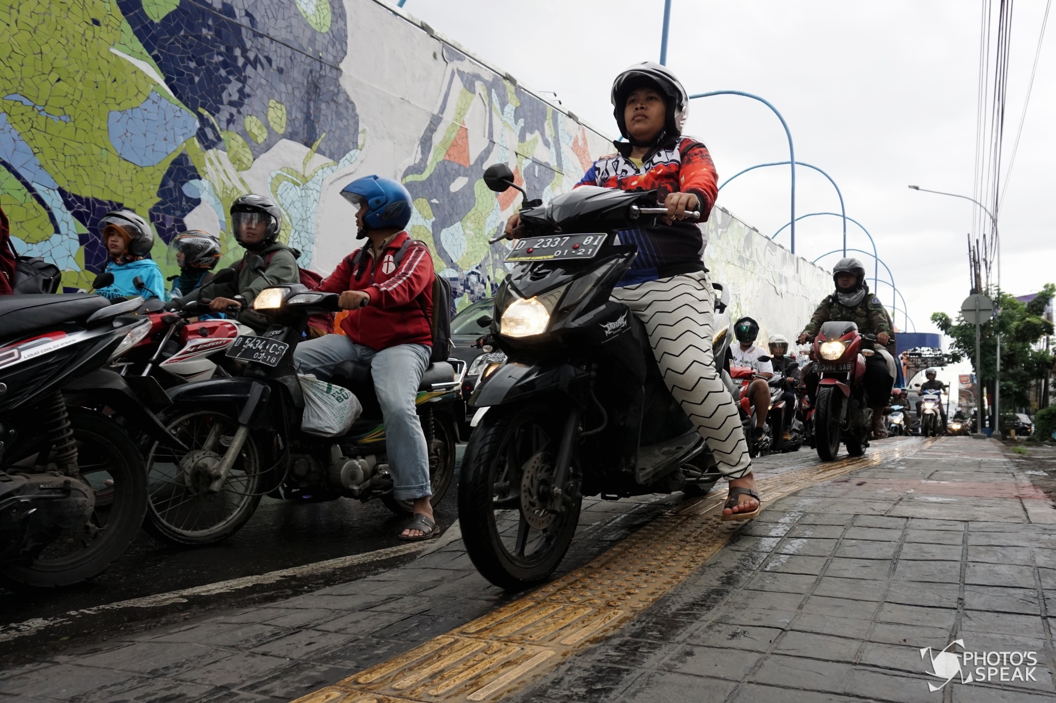 Sejumlah pengendara motor menggunakan jalan trotoar untuk menghindari kemacetan di kawasan Flyover Antapani, Jalan Terusan Jakarta, Kota Bandung, Kamis (6/4/2017). Kurang taatnya pengendara membuat jalur pejalan kaki digunakan oleh sebagian pengendara motor tanpa memperhatikan tata tertib berlalu lintas. PHOTO'S SPEAK / Angga Indrajid