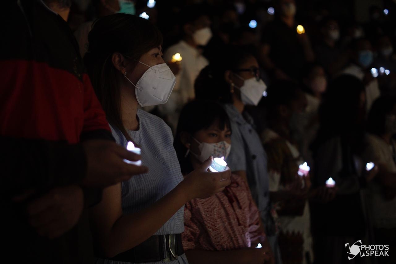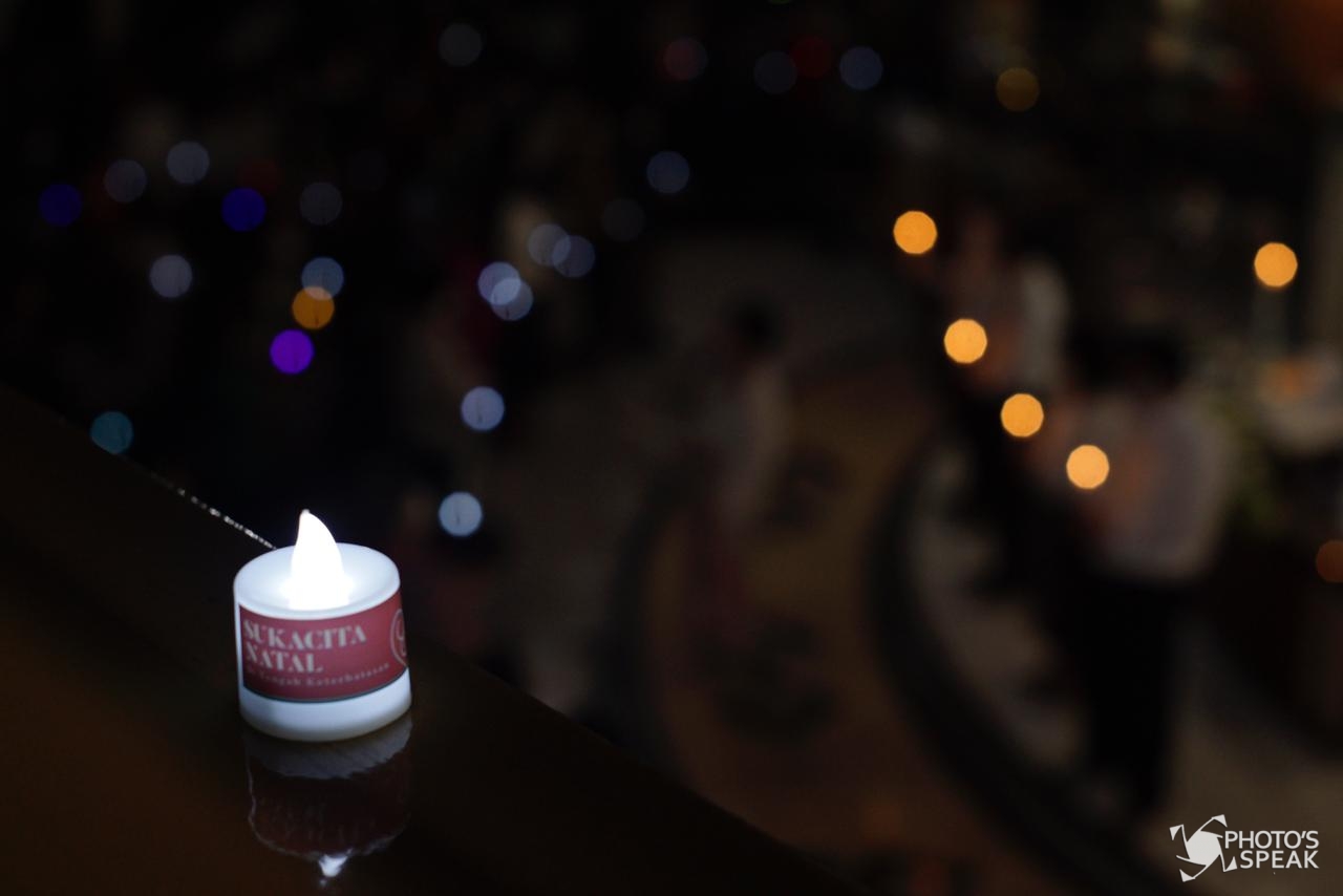 Jemaat merayakan ibadah malam Natal di Gereja Kristen Indonesia Maulana Yusuf, Bandung, Jawa Barat, Sabtu (24/11/2022). Umat Kristiani menjalankan ibadah yang diikuti secara luring maksimal 100 persen dari kapasitas ruangan jelang Natal pada 25 Desember dengan menggunakan lilin elektrik untuk mengurangi sampah lilin. (Photo’s Speak/Ditya Rafi Muttaqin)