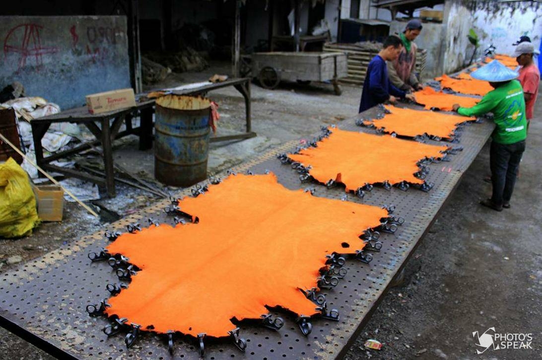 Pekerja menjemur kulit di rumah produksi Kampung Babakan, Desa Nanjung Mekar, Kecamatan Rancaekek, Kabupaten Bandung, Kamis (15/3/2018). Dalam sehari rumah produksi ini mampu menghasilkan sekitar 200 hingga 500 lembar kulit setengah jadi yang dibanderol dengan harga Rp. 16 ribu hingga Rp 28 ribu per 30 centimeter persegi tergantung jenisnya yang dikirim ke kawasan Bali untuk diolah menjadi keperluan jaket, tas, dan kursi sofa. PHOTO'S SPEAK / Ridha Achmad