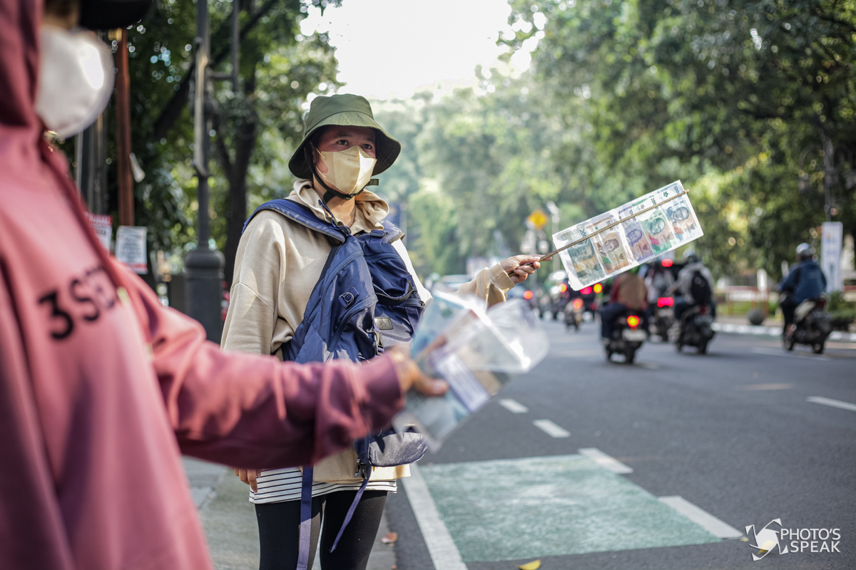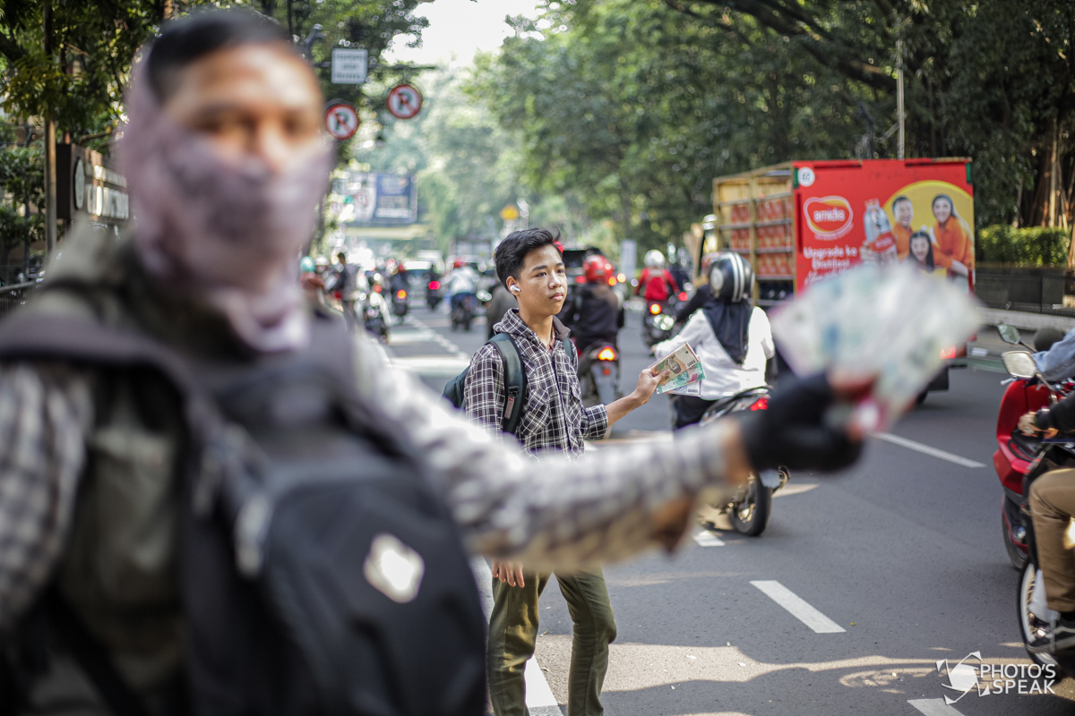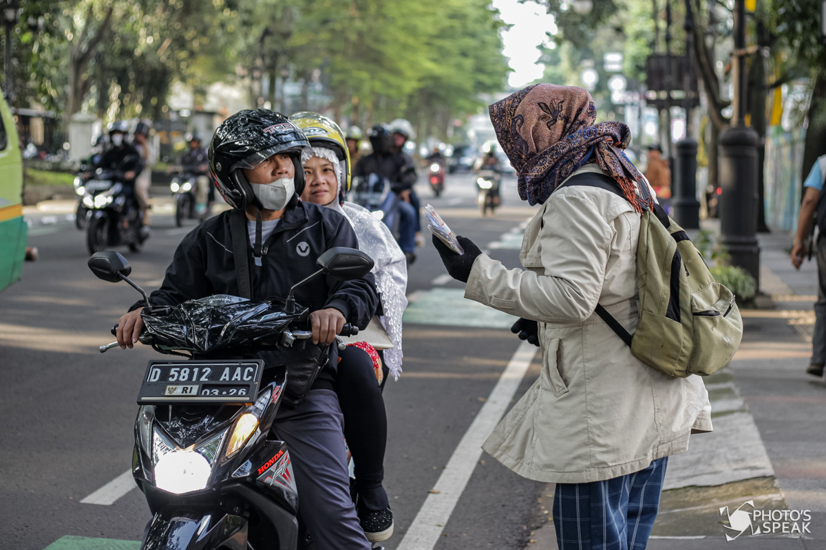 Penjual jasa penukaran uang menawarkan uang baru kepada pengguna jalan di Jalan Merdeka, Kota Bandung, Selasa (2/4/2024). PHOTOSSPEAK/Ilham Ahmad Nazar
