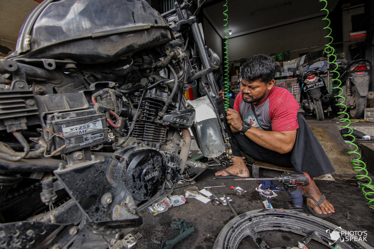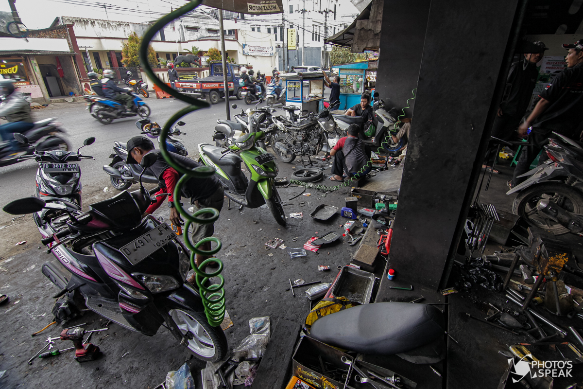 Mekanik memperbaiki sepeda motor di salah satu bengkel, Banjaran, Kabupaten Bandung, Kamis (27/3/2024). PHOTOSSPEAK/Ilham Ahmad Nazar