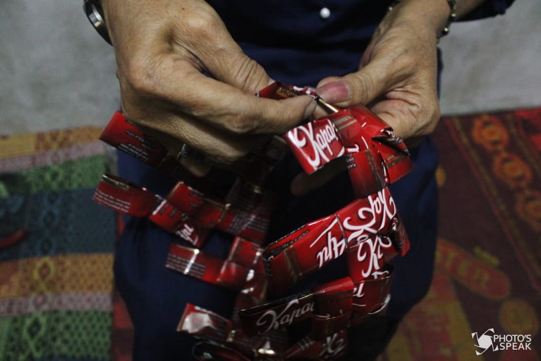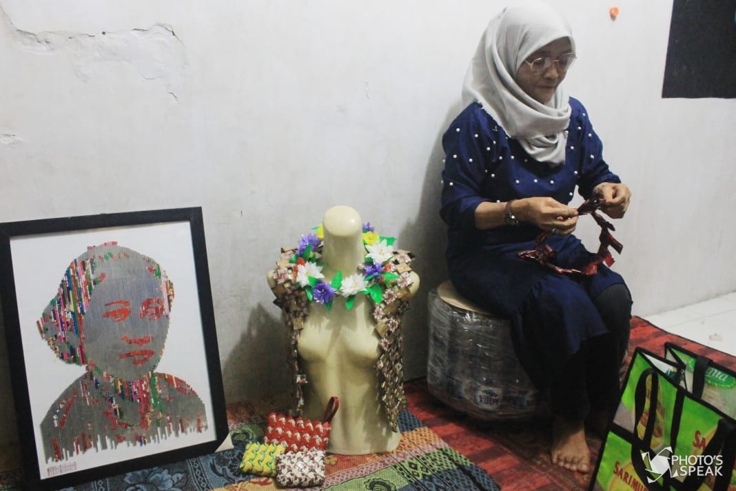 Perajin membuat anyaman dari limbah plastik di galeri Kreasindo, Komplek Bumi Panyileukan, Kelurahan Cipadung Kidul, Kecamatan Panyileukan, Kota Bandung, Selasa (8/10/2019). Memanfaatkan sisa plastik yang dibuat kerajinan seperti miniatur, sketsa wajah, taplak meja dan lain-lain, merupakan salah satu penanggulangan limbah plastik yang berdampak pada lingkungan. PHOTO'S SPEAK / Awliya El Salam M