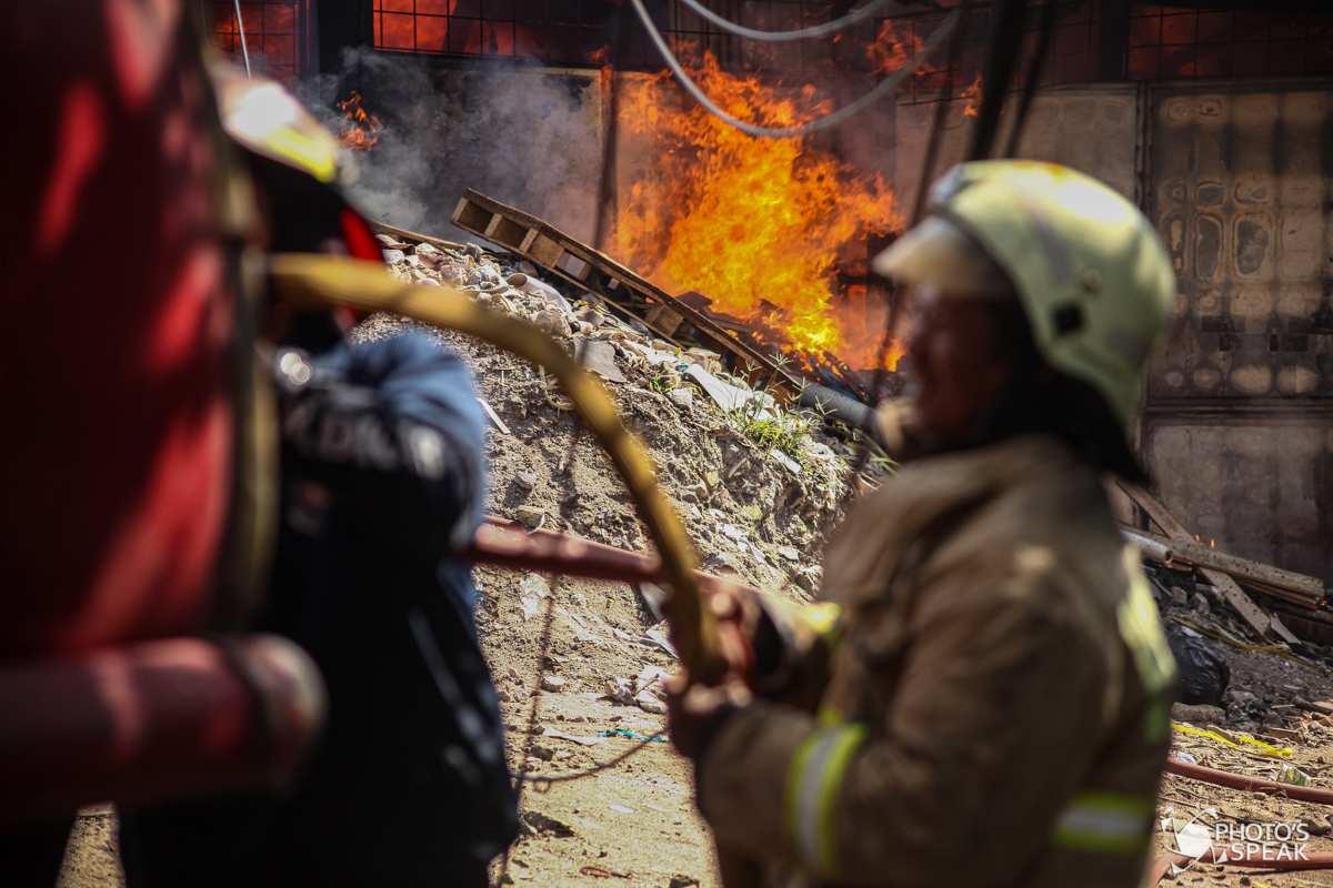 Petugas pemadam kebakaran berupaya memadamkan kobaran api yang membakar gudang rongsokan di Banjaran, Kabupaten Bandung, Kamis (11/4/2024). PHOTOSSPEAK/Ilham Ahmad Nazar