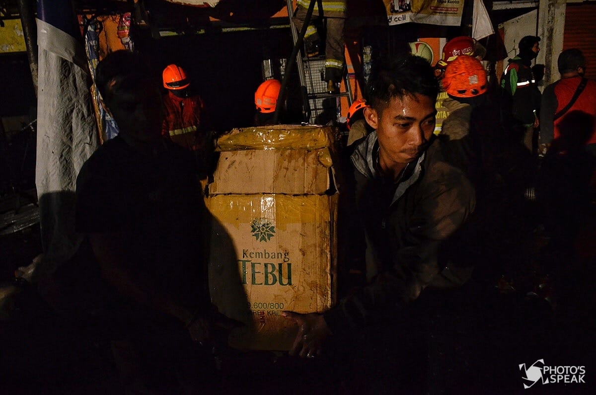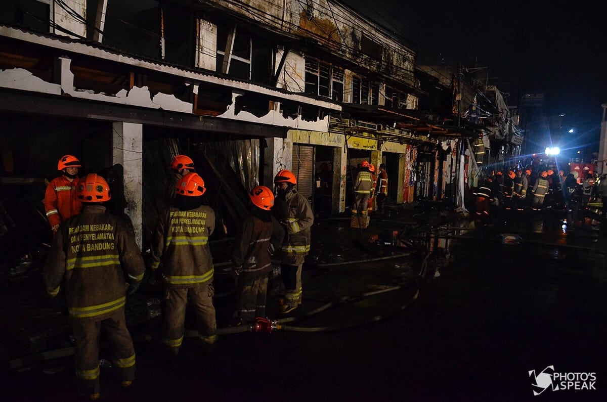 Petugas Dinas Pemadam Kebakaran dan Penanggulangan Bencana (DPKPB) Kota Bandung melakukan pendingingan lokasi kebakaran ruko di Jalan Oto Iskandardinata, Kota Bandung, Minggu (6/9/2020). Kebakaran yang melahap sekitar 13 ruko tersebut diduga akibat korsleting listrik. Sebanyak 24 unit mobil pemadam kebakaran dikerahkan untuk memadamkan api di lokasi tersebut. PHOTO'SSPEAK/ Fakhrul Maulana