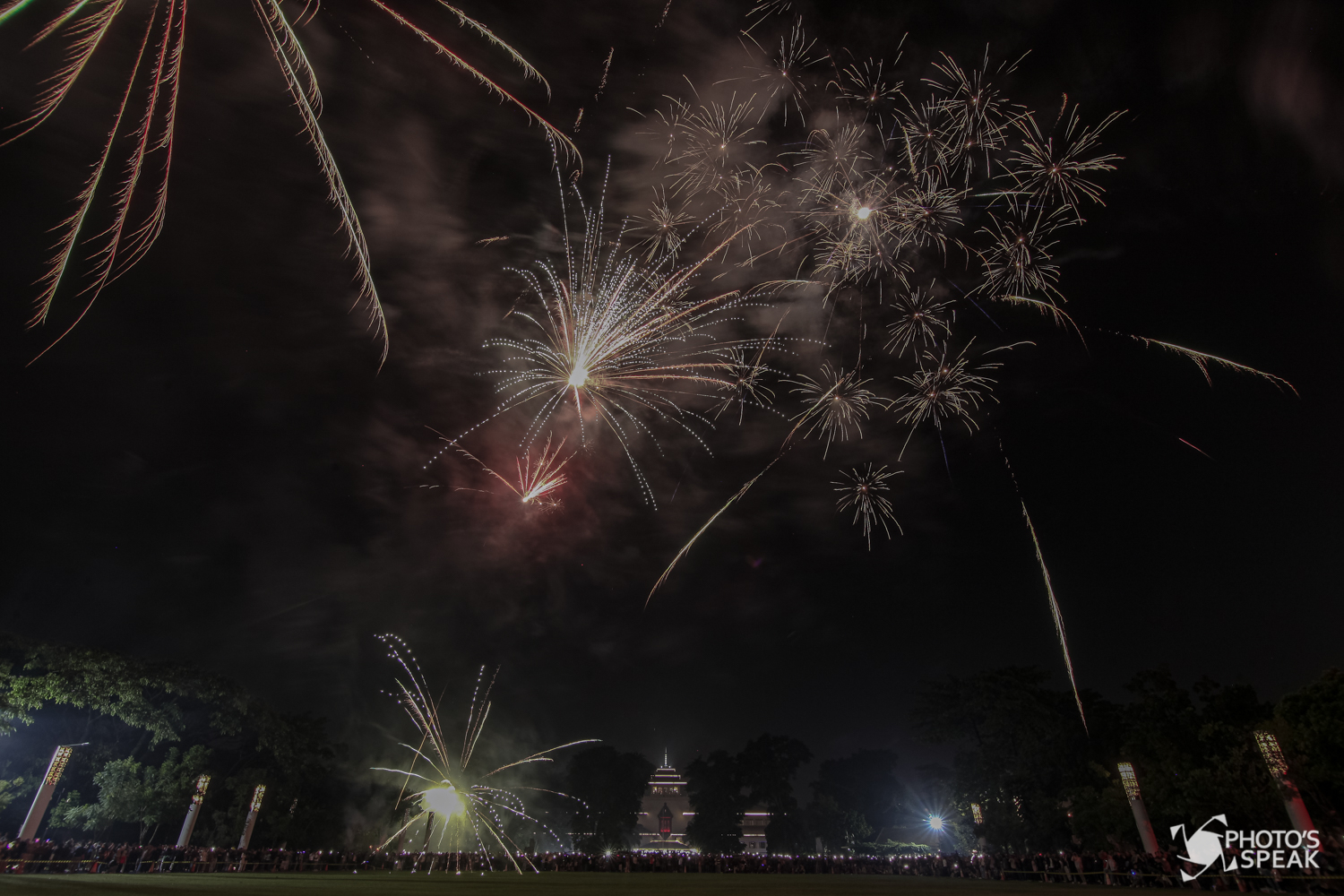 Kilauan kembang api dengan background Gedung Sate di Jalan Diponegoro, Kota Bandung, Minggu (31/12/2023). Hiburan kembang api tersebut menjadi magnet tersendiri bagi masyarakat untuk merayakan malam tahun baru 2024. PHOTO'SSPEAK/Ilham Ahmad Nazar