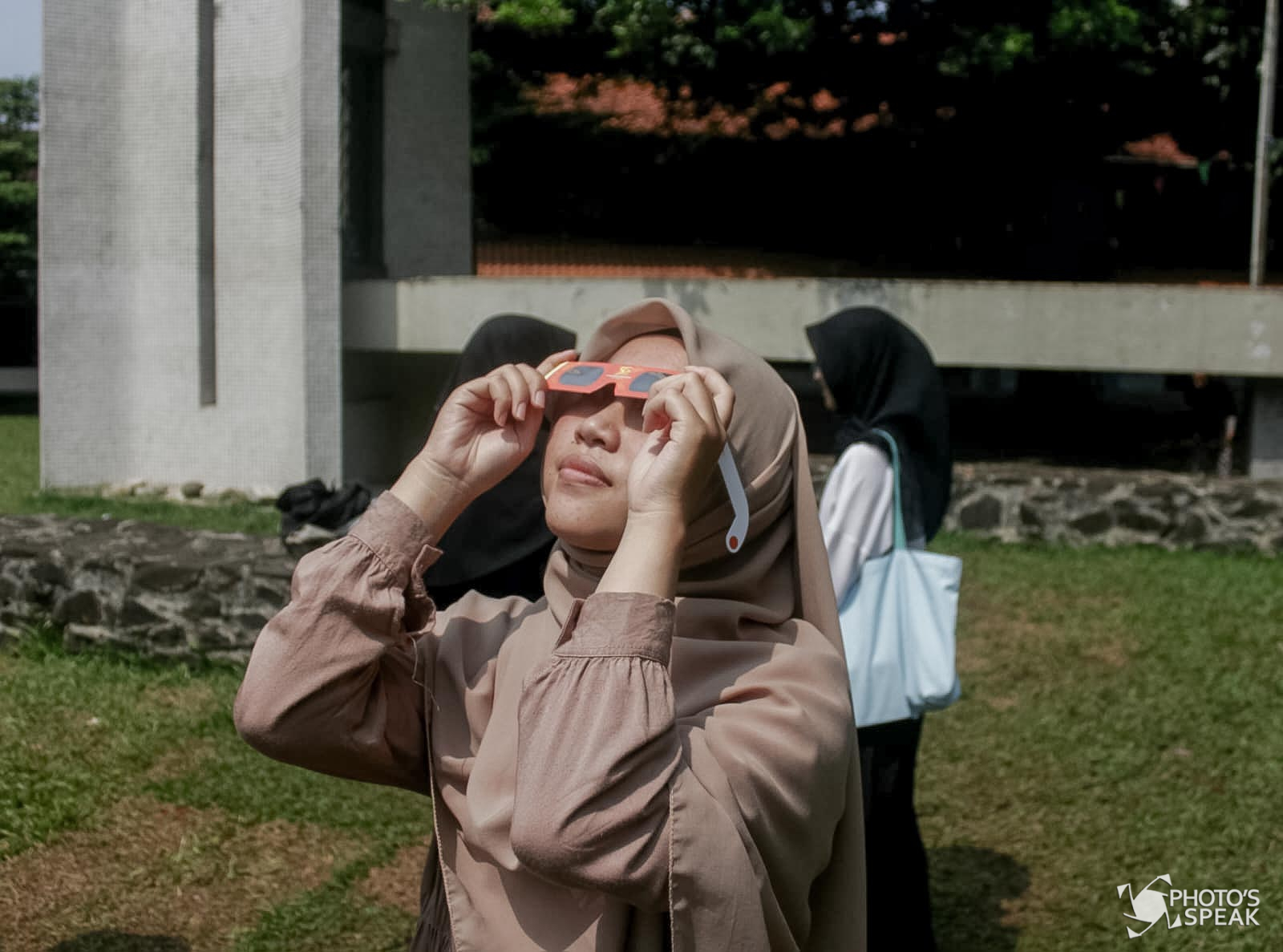 Umat Islam melaksanakan salat sunah kusuf di Masjid Salman ITB, Jalan Ganesha, Kota Bandung, Kamis (20/4/2023). Salat sunah kusuf dilakukan bertepatan dengan fenomena gerhana matahari hibrida yang terjadi di Indonesia. Selain melaksanakan salat sunah kusuf, jamaah juga bisa ikut melihat observasi gerhana matahari di area rumput depan masjid dengan berbagai macam alat khusus seperti teleskop, kacamata matahari, kamera pinhole (kamera lubang jarum), dan binokular. PHOTO'S SPEAK/Alifya Syifaa