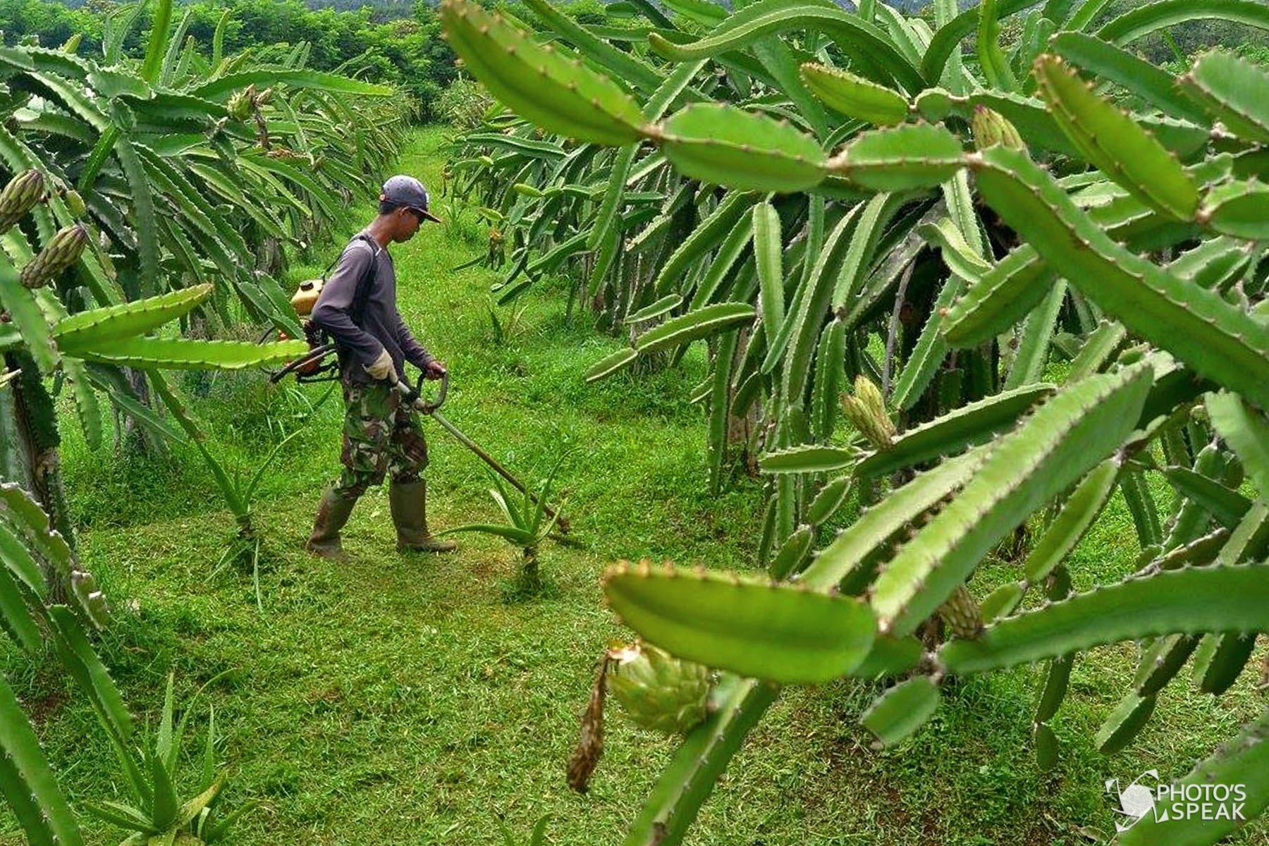 Pekerja membersihkan rumput liar di areal perkebunan buah naga di Desa Citaman, Kecamatan Nagreg, Kabupaten Bandung, Kamis (3/11/2016). Buah naga yang dipasarkan ke supermarket dan pasar tradisional ini membutuhkan perawatan khusus agar mengahasilkan buah berkualitas baik. PHOTO'S SPEAK/Naufal Azhar Syauqi
