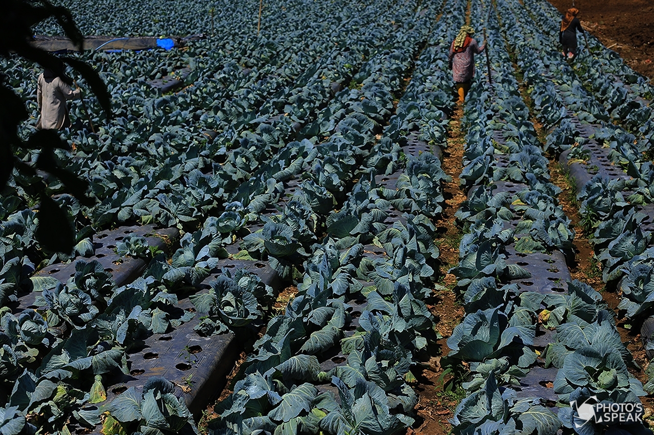 Sejumlah petani merawat sayuran kol di Kampung Tugu, Desa Tugumukti, Kecamatan Cisarua, Kabupaten Bandung Barat, Sabtu (26/8/2017). Saat musim kemarau tiba hasil panen meningkat sebanyak empat sampai lima kwintal, yang biasanya mendapat dua kwintal di musim hujan karena banyaknya sayuran yang membusuk. Hasil tani tersebut didistribusikan ke pasar pasar induk dengan harga Rp.5000/kg. PHOTO'S SPEAK / Rizal Fauzi Akbar