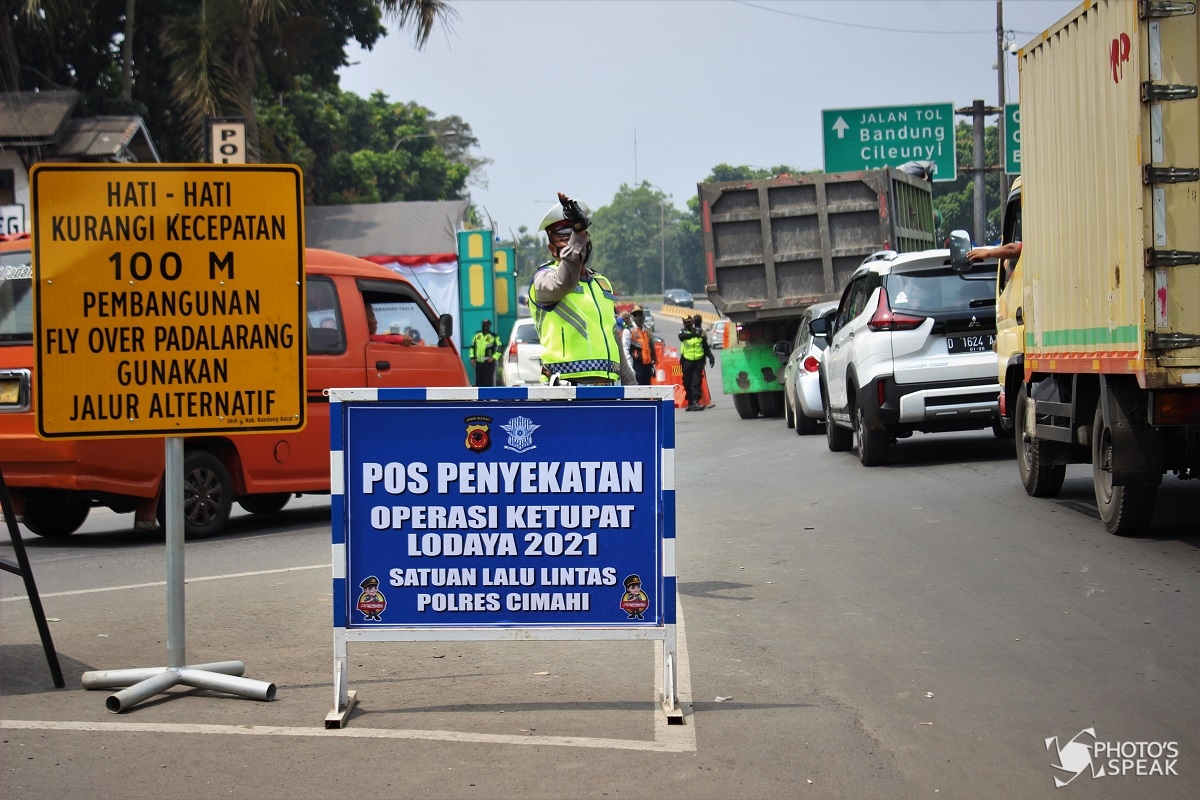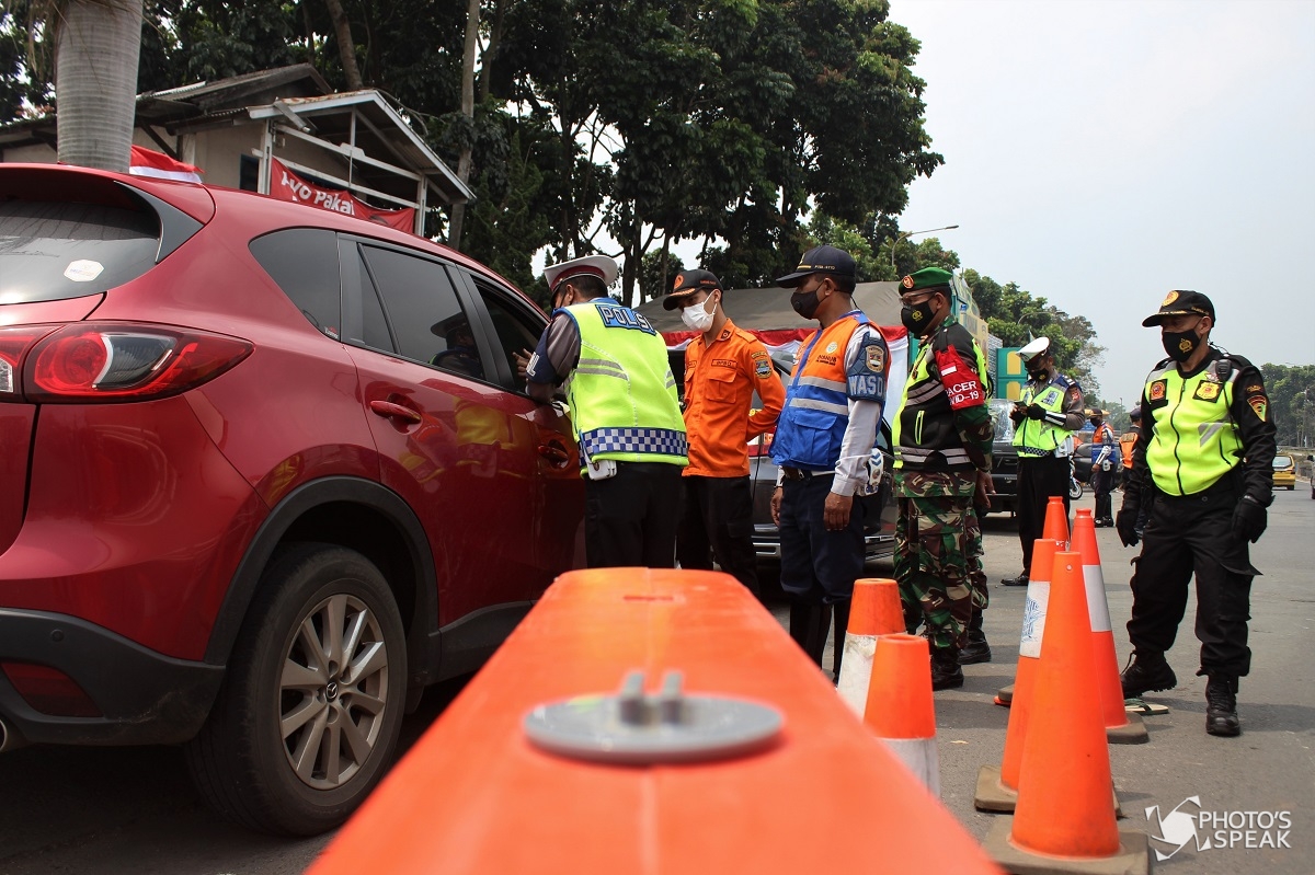 .Sejumlah personel Kepolisian Polres Cimahi memberhentikan dan memeriksa kelengkapan identitas kendaraan di Pos penyekatan mudik Gerbang Tol Padalarang, Kabupaten Bandung Barat, Kamis (6/5/2021). Kegiatan penyekatan larangan mudik yang digelar Polres Cimahi bertujuan untuk menegakkan aturan pemerintah yang melarang mudik pada momen lebaran dari tanggal 6 Mei 2021 hingga 17 Mei 2021 guna memutus mata rantai penyebaran COVID-19. PHOTOS’SPEAK/Brilliant Awalludin Jayadinata