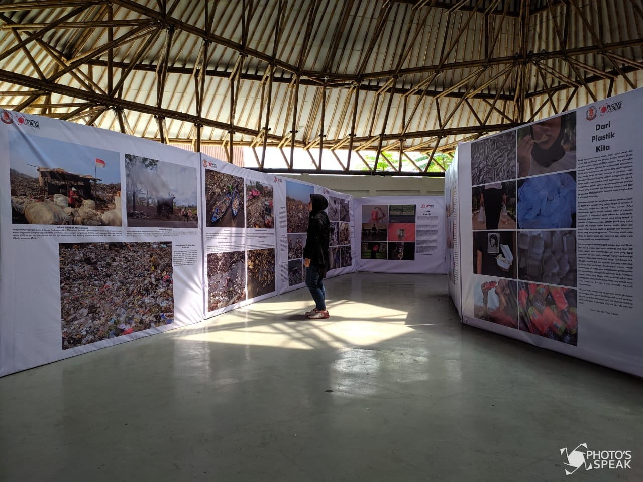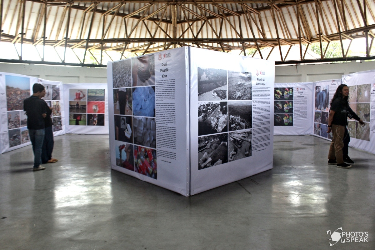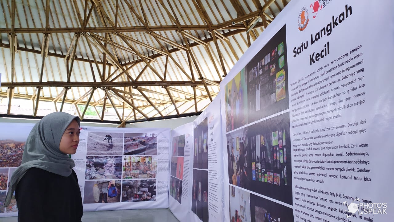 Pengunjung mengamati karya foto di Teras Sunda Cibiru, Jalan Raya Cipadung, Kota Bandung, Jumat (31/1/2020). Pameran foto bertajuk T(h)uman ini menampilkan 19 foto single dan 13 foto story yang bertujuan mengajak masyarakat untuk bijak dalam menggunakan sampah plastik demi mengurangi penumpukan sampah plastik. PHOTO'SSPEAK/ Deden Adrian