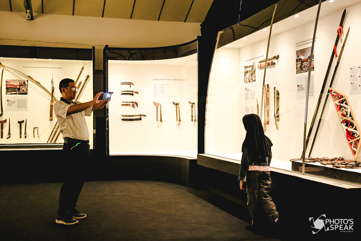 Pengunjung berswafoto bersama koleksi pusaka asal Kalimantan Barat yang dipamerkan dalam Pameran Pusaka Nusantara di Museum Sri Baduga, Bandung, Jawa Barat, Minggu (3/8/2025). Tahun ini, Kota Bandung menjadi tuan rumah penyelenggaraan Pameran Pusaka Nusantara yang menampilkan 238 koleksi, seperti kujang, keris, kudi, dan pedang. Koleksi tersebut berasal dari 21 museum di berbagai wilayah Indonesia. Pameran ini digelar dalam rangka ajang pelestarian dan promosi warisan budaya bangsa. PHOTOSSPEAK/Malky Ristian Fauzi