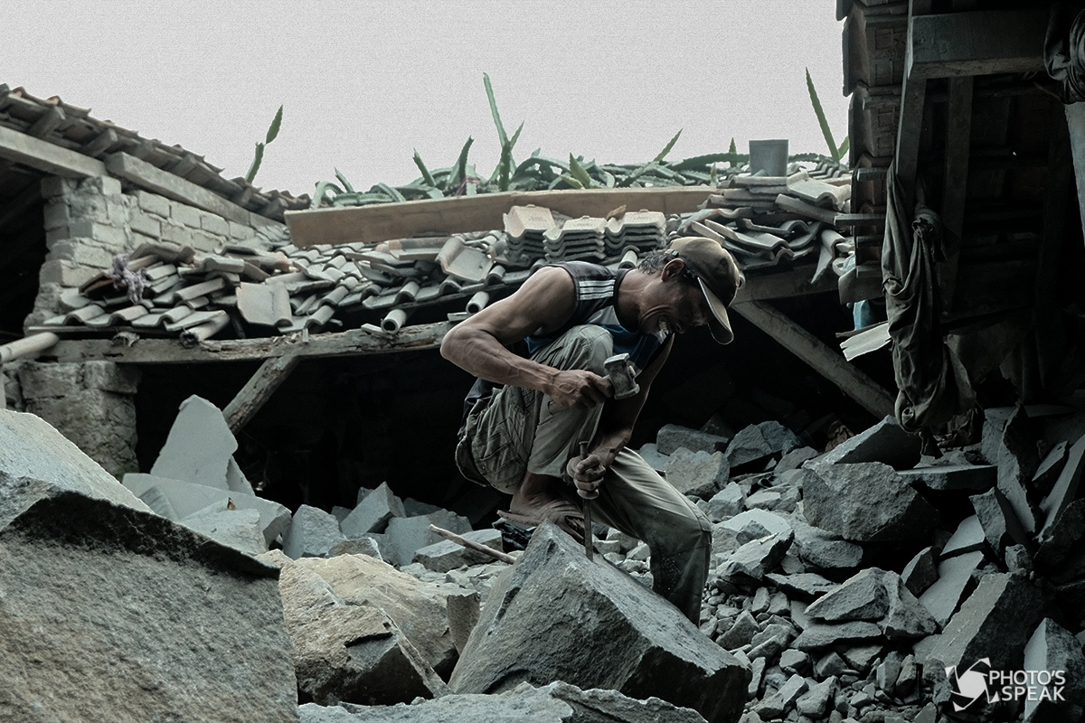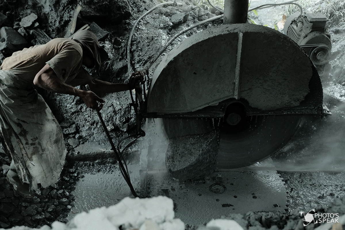 Pekerja memotong batu andesit untuk bahan awal cobek di Perusahaan Batu Alam Karunia, Jalan Cidadap, Desa Cidadap, Kecamatan Cidadap, Kabupaten Bandung Barat, Selasa (11/08/2020). Perusahaan Batu Alam Karunia yang sejak 1980 menggunakan batu alam sebagai bahan utama pembuatan cobek ini, dalam seharinya bisa membuat sampai 200 cobek, dengan harga jual dari Rp 25 ribu hingga Rp 100 ribu per buah. PHOTO'SSPEAK/ Fakhri Fadlurrohman