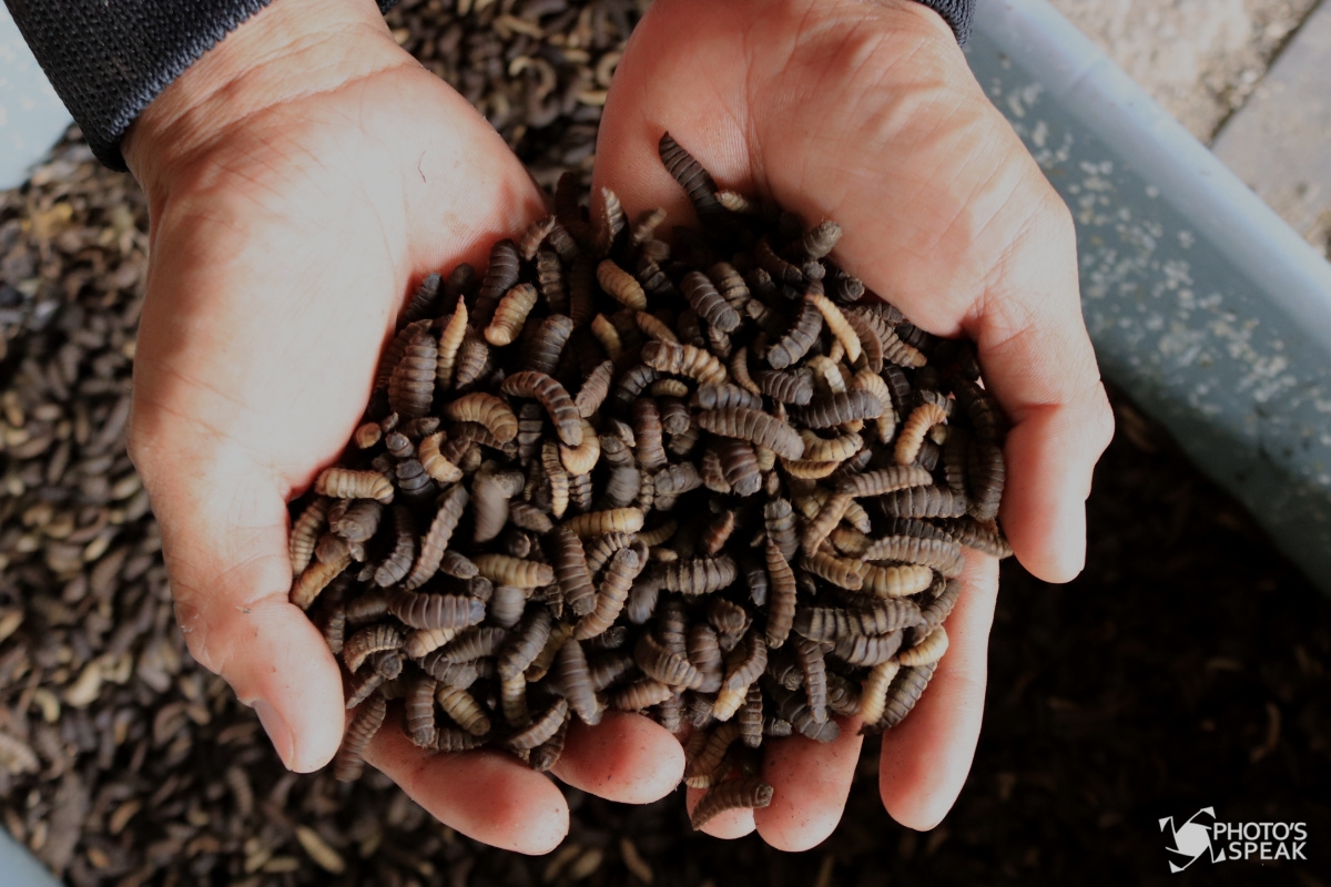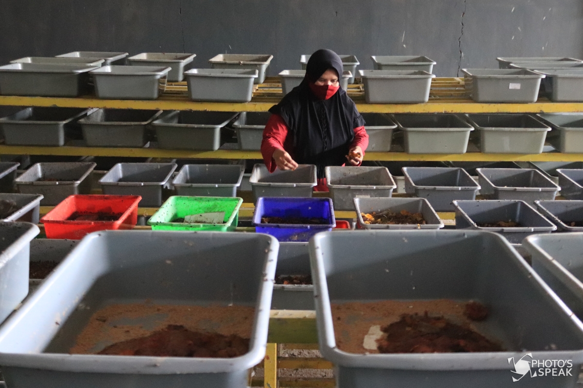 Pekerja memberi makan maggot di UPT Puspa, Kampung Jelekong, Kecamatan Baleendah, Kabupaten Bandung, Senin (1/11/2021). Maggot atau larva dewasa yang berasal dari telur Black Soldier Fly (BSF) dapat mengurai 3 ton sampah dalam seharinya. PHOTOSSPEAK / M Bilal Mubarok