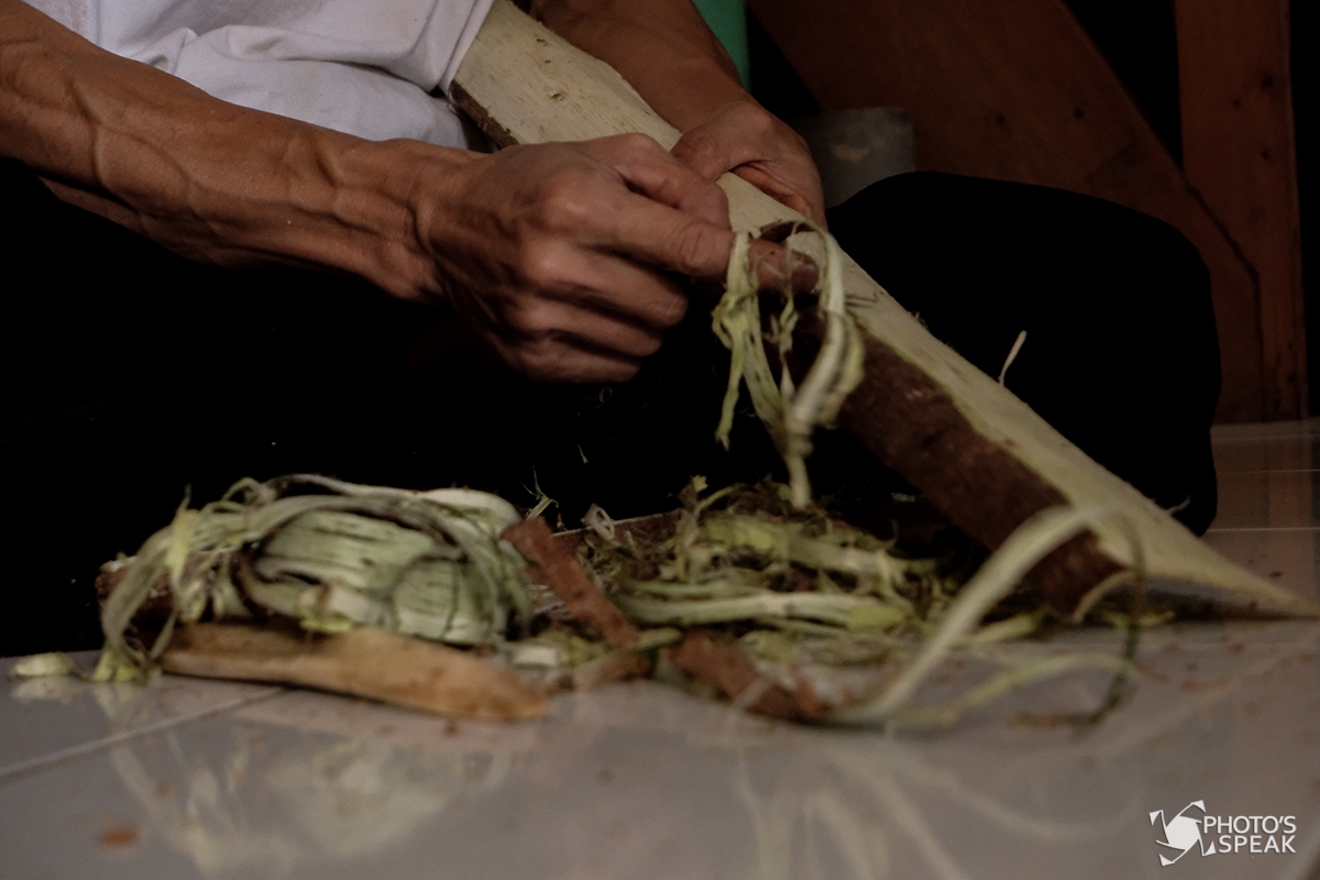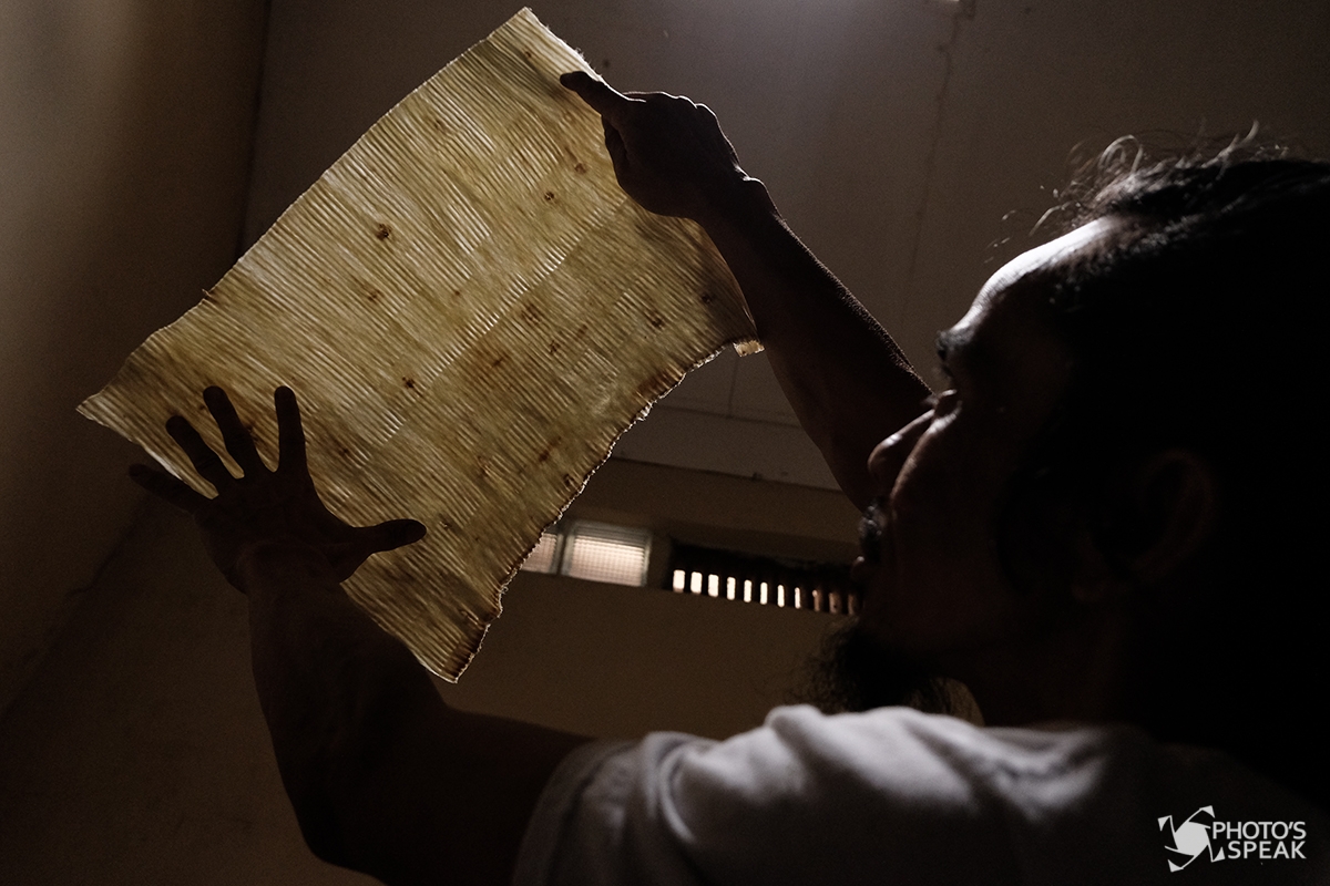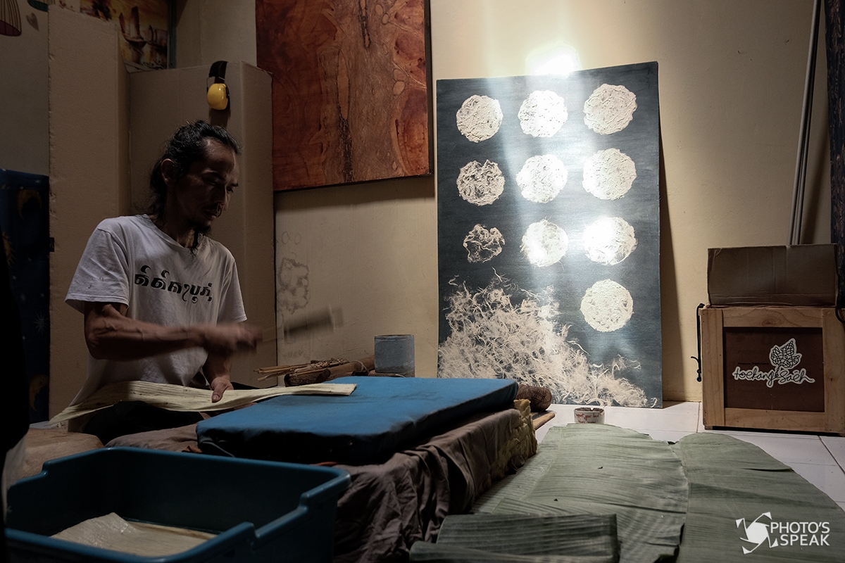 Ahmad Mufid Saruri (46) menempa kulit kayu saeh untuk dijadikan daluang di Lab Toekang Saeh, Jalan Koperasi Raya, Kota Bandung, Kamis (16/07/2020). Produksi yang dimulai sejak tahun 2006 ini dilakukan secara manual menggunakan teknik kempa sehingga menghasilkan daluang yang difungsikan sebagai media tulis atau gambar. PHOTO'SSPEAK/ Fakhri Fadlurrohman
