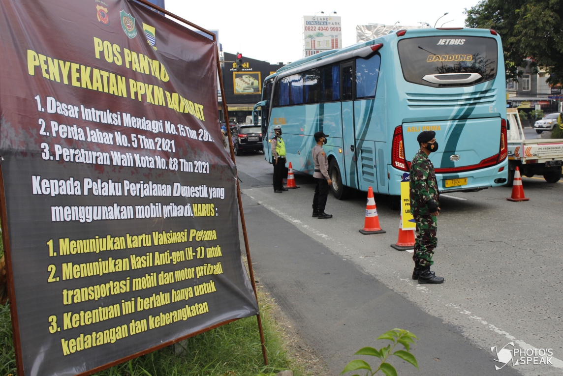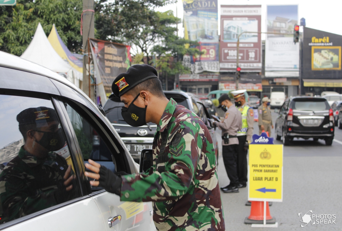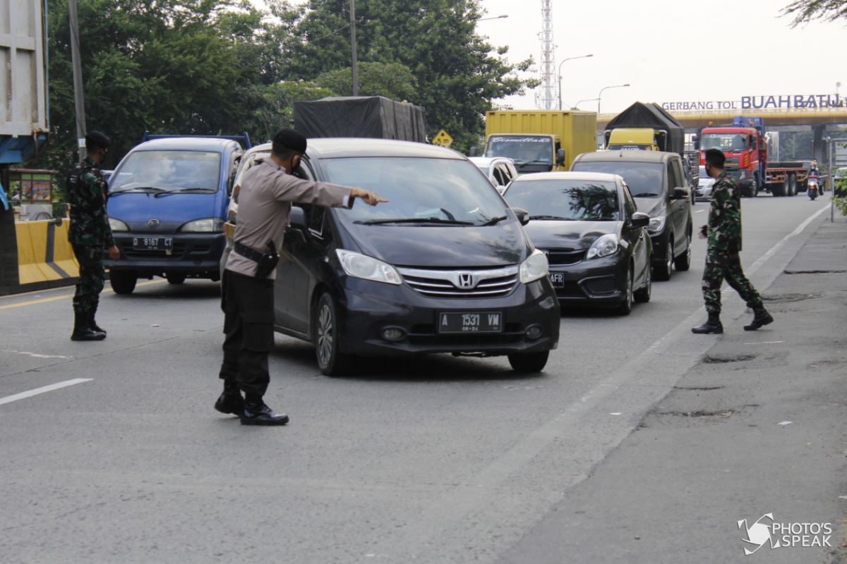 Personel kepolisian memeriksa kelengkapan dokumen pengendara saat penyekatan di pintu keluar Tol Buah Batu , Kota Bandung, Selasa (13/07/21). Operasi gabungan penyekatan yang secara rutin digelar TNI-Polri, Satpol PP, bersama Dishub Kota Bandung, dengan memeriksa kelengkapan dokumen perjalanan sesuai aturan PPKM Darurat Jawa-Bali. (PHOTO'S SPEAK / Acep Maulana)
