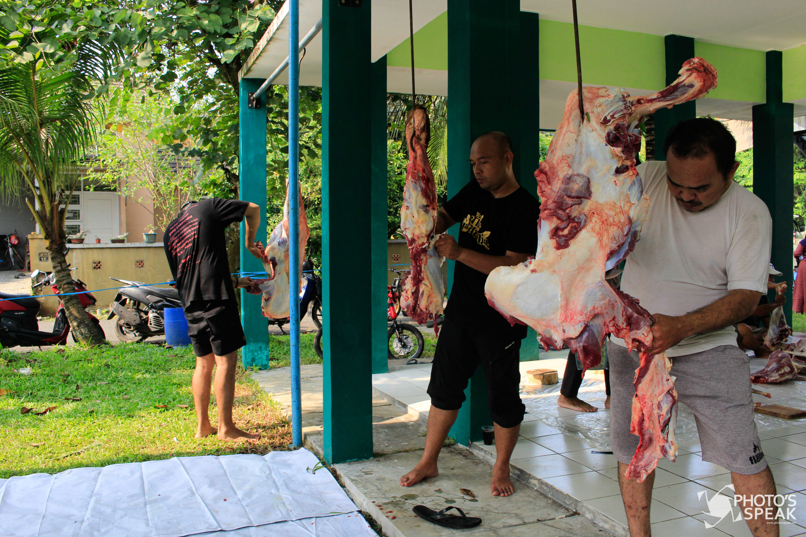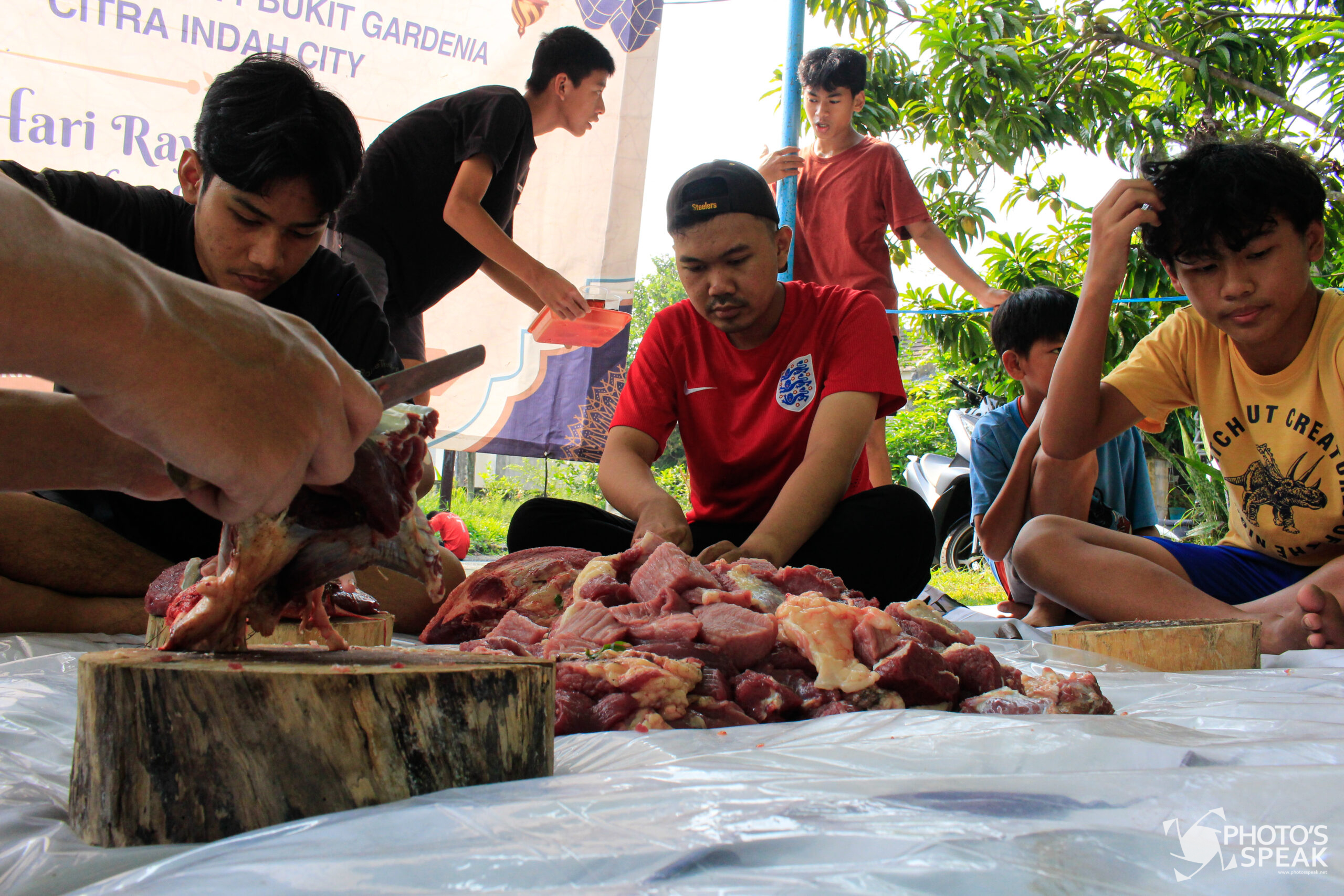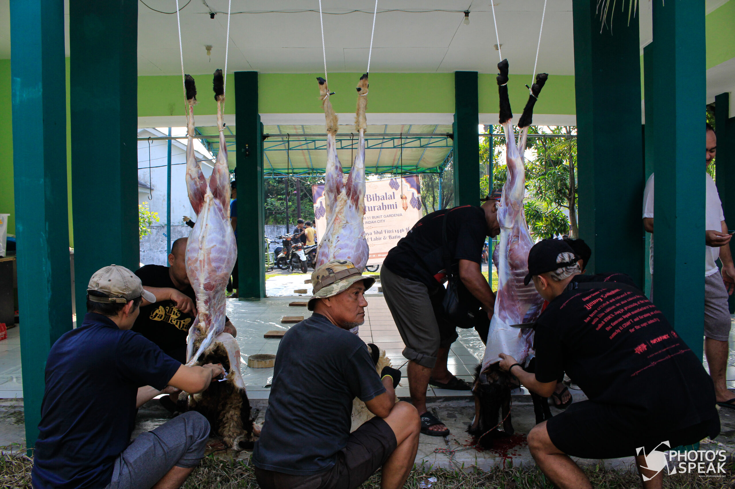 Panitia kurban menyembelih hewan kurban di halaman Masjid Al Islah, Citra Indah, Jonggol, Kabupaten Bogor, Sabtu (7/6/2025). Meski pemerintah menetapkan Idul Adha 1446 H jatuh pada 6 Juni 2025, pemotongan hewan kurban dilakukan keesokan harinya. PHOTOSSPEAK/Rananda Maurah.