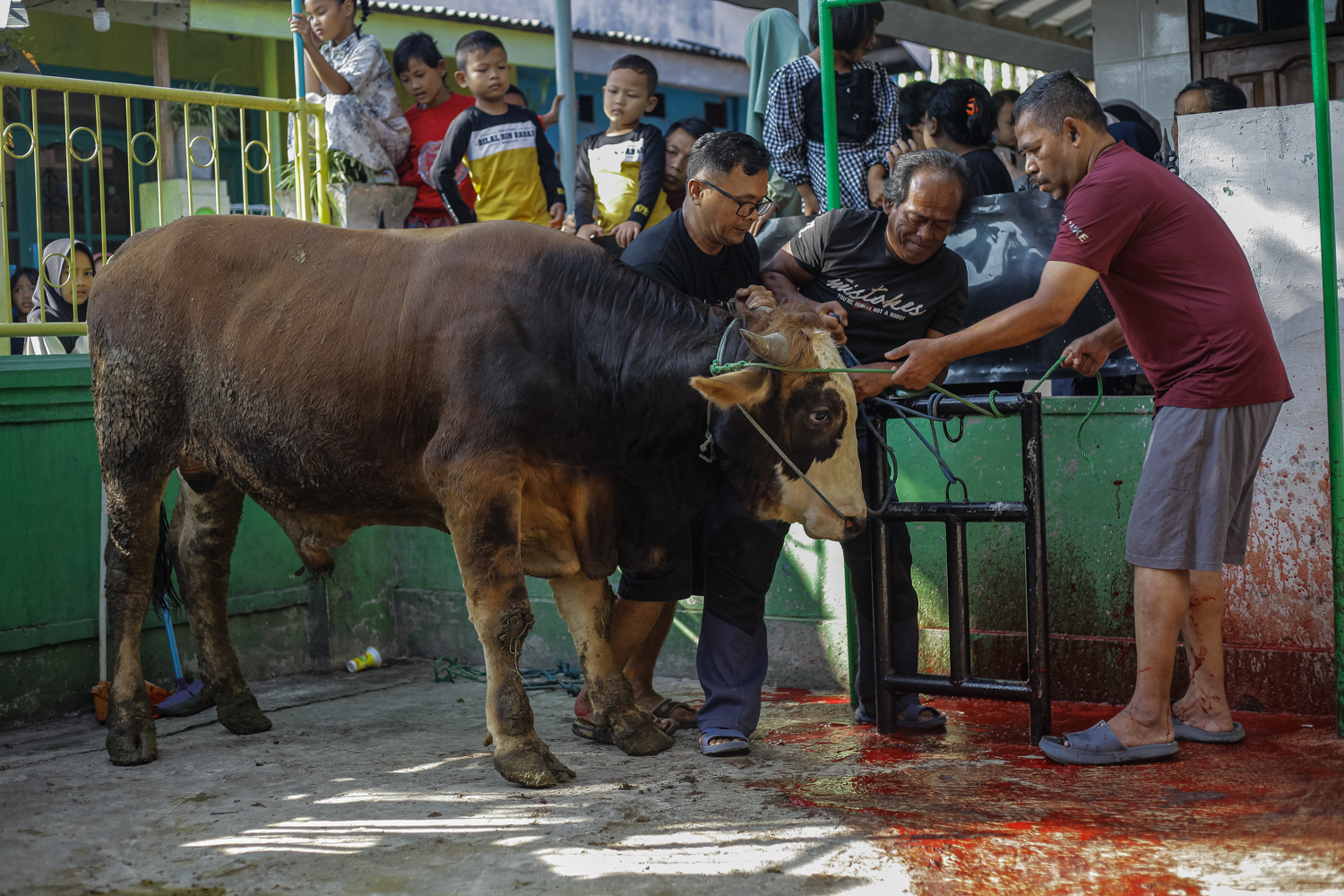 Petugas bersiap menyembelih sapi kurban di Masjid Persatuan Islam Cintaasih, Banjaran, Kabupaten Bandung, Senin (17/6/2024). PHOTOSSPEAK/Ilham Ahmad Nazar