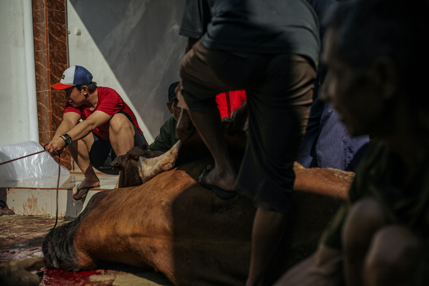 Petugas menggenggam tali tambang saat sapi kurban disembelih di Masjid Persatuan Islam Cintaasih, Banjaran, Kabupaten Bandung, Senin (17/6/2024). PHOTOSSPEAK/Ilham Ahmad Nazar