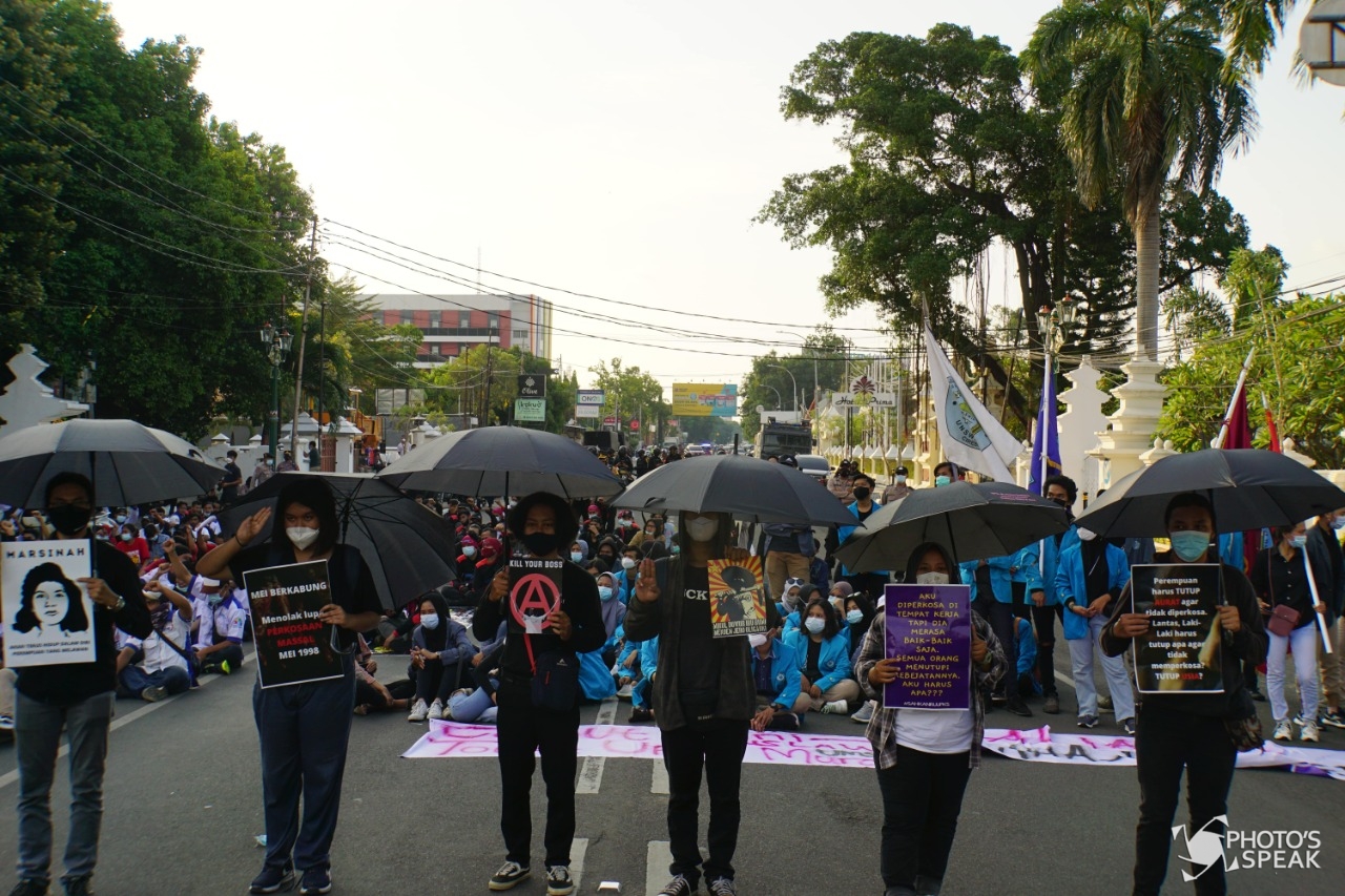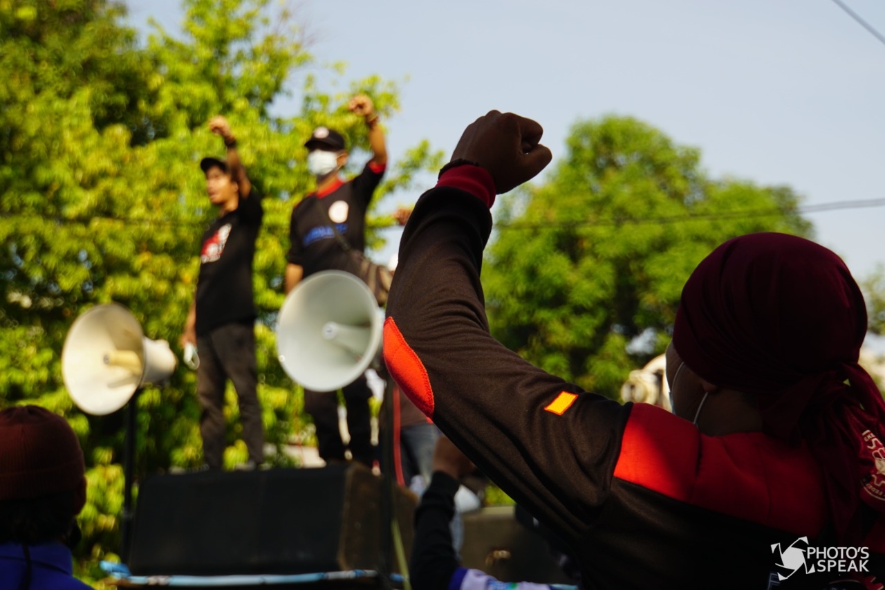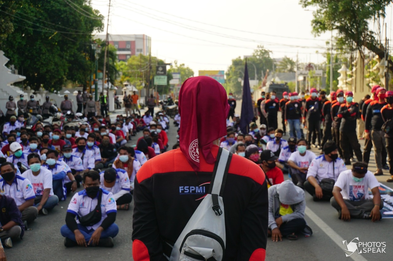 Sejumlah buruh yang tergabung dalam FSPMI dan didukung oleh aliansi Mahasiwa Cirebon melakukan aksi di depan gedung DPRD Kota Cirebon, Sabtu,(1/5/2021) Dalam aksinya pada hari buruh Internasional 2021, buruh menuntut berbagai tuntutan kepada Pemerintah Provinsi Jawa Barat, salah satunya dicabutnya UU Cipta Kerja yang dianggap menghilangkan hak konstitusional kaum buruh. Photo’s Speak / Adi Nursobah