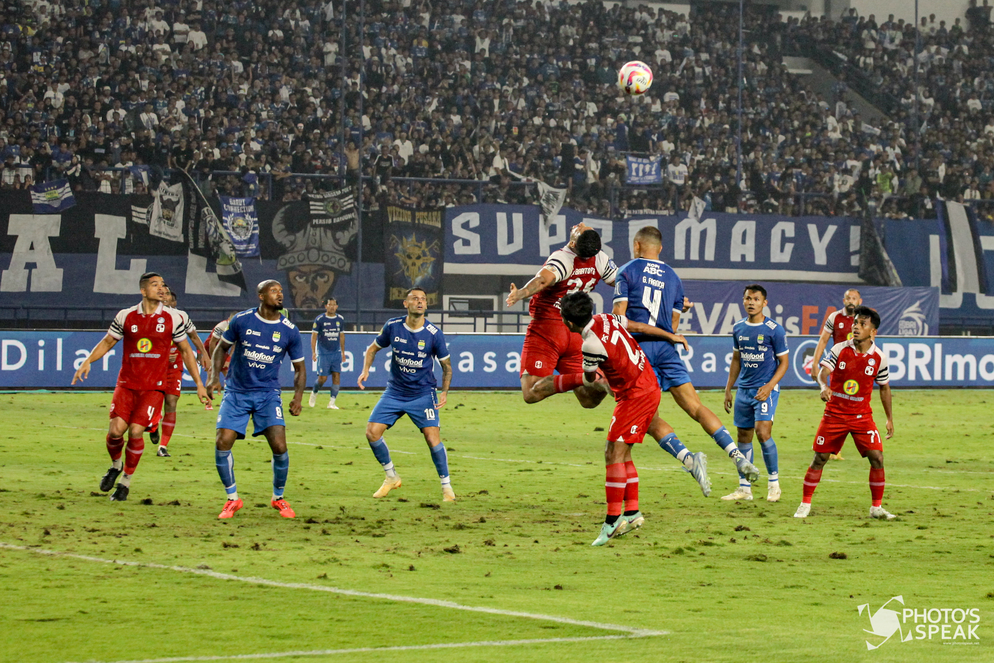 Pesepak bola Persib Bandung, Gustavo Franca (kanan), berebut bola udara dengan pesepak bola Barito Putera, Murilo Mendes (tengah) dan Tegar Infantrie (kiri), dalam pertandingan BRI Liga 1 di Stadion Gelora Bandung Lautan Api (GBLA), Kota Bandung, Jumat (9/5/2025). Barito Putera berhasil menahan imbang tuan rumah Persib Bandung dengan skor 1-1. PHOTOSSPEAK/Ilham Ahmad Nazar.