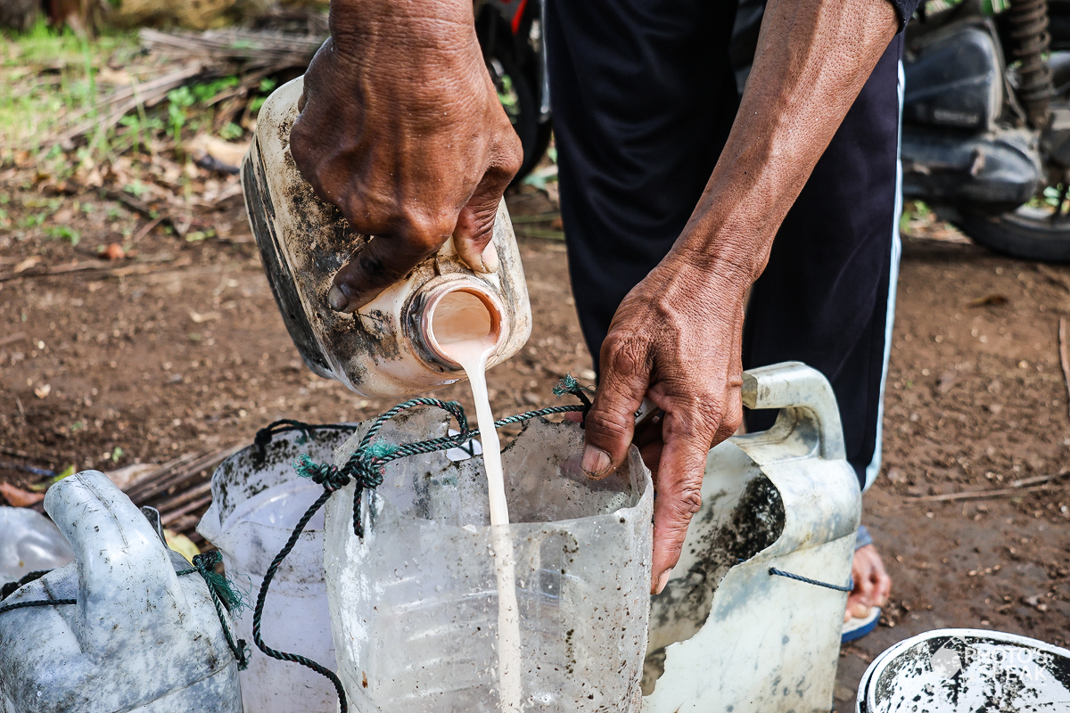 Pak Sodikin (52) memasukkan kapur ke dalam wadah sebelum menyadap nira kelapa di Desa Legokjawa, Kabupaten Pangandaran, Jawa Barat, Selasa (1/4/2025). Ia mampu menyadap nira dari hingga 25 pohon kelapa atau sekitar 40 liter per hari. Nira tersebut digunakan sebagai bahan baku pembuatan gula serta kecap manis. Pak Sodikin juga membayar sewa lahan kepada pemilik sebesar Rp150 ribu per tahun. PHOTOSSPEAK/Malky Ristian Fauzi.