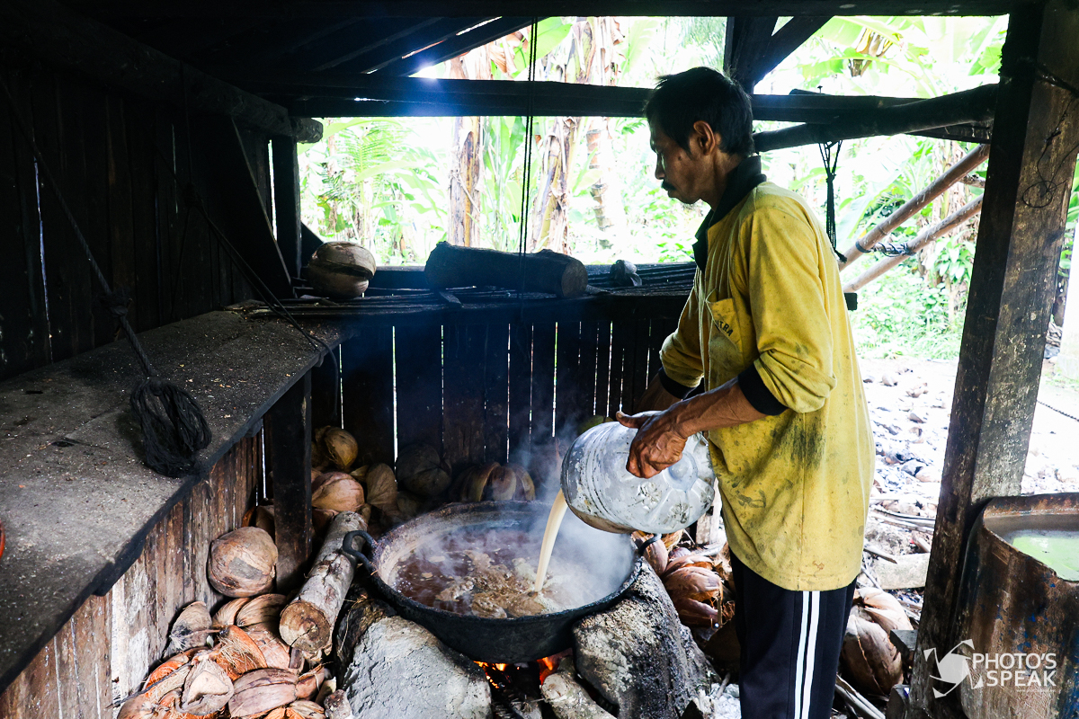 Pak Sodikin (52) menuangkan nira ke wajan di Desa Legokjawa, Kabupaten Pangandaran, Jawa Barat, Selasa (1/4/2025). Ia mampu menyadap nira dari hingga 25 pohon kelapa, menghasilkan sekitar 40 liter nira per hari. Nira tersebut digunakan sebagai bahan baku pembuatan gula serta kecap manis. Selain itu, ia membayar sewa lahan kepada pemilik sebesar Rp150 ribu per tahun. PHOTOSSPEAK/Malky Ristian Fauzi.