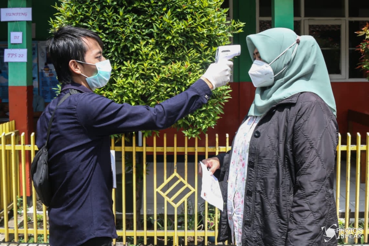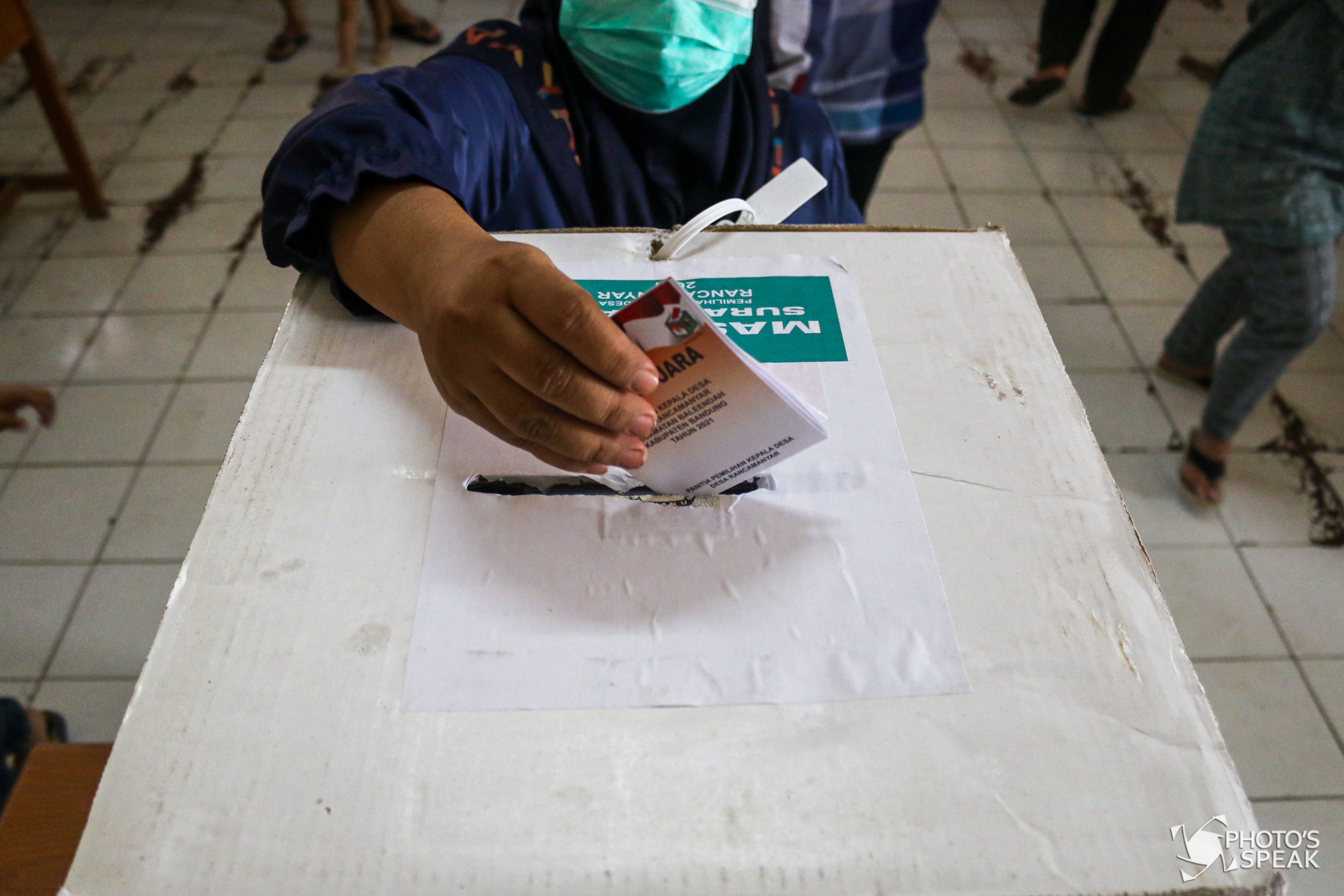 Pemilih mencoblos surat suara di dalam bilik saat pelaksanaan Pemilihan Kepala Desa (Pilkades) serentak di TPS 25 Desa Rancamanyar, Kabupaten Bandung, Rabu, (20/10/2021). Sebanyak 49 desa yang berada di 24 kecamatan di Kabupaten Bandung melaksanakan Pemilihan Kepala Desa (Pilkades) secara serentak setalah tertunda sejak Juli 2021 akibat pandemi Covid-19. PHOTO’S SPEAK / Fuad Mutashim