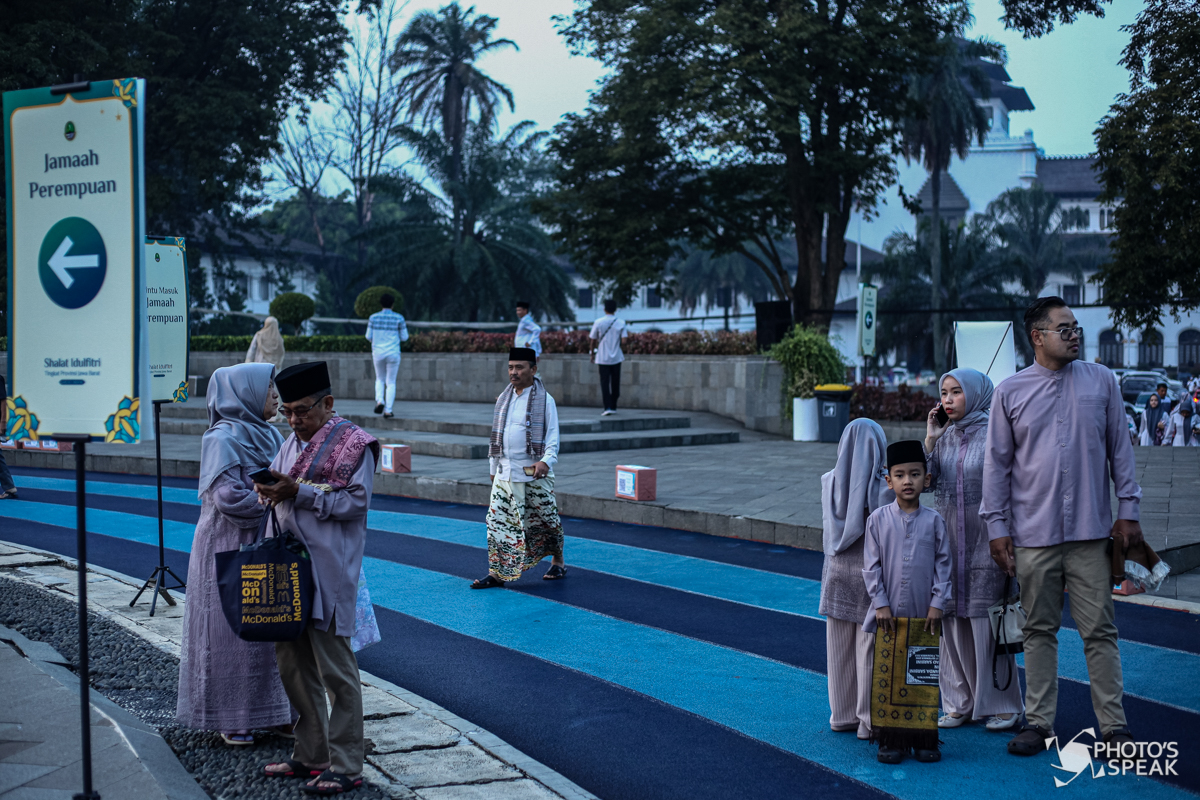 Umat muslim berdatangan untuk melaksanakan salat Idulfitri di Lapangan Gasibu, Kota Bandung, Rabu (10/4/2024). Pemerintah mentapkan 1 Syawal 1445 Hijriah jatuh pada Rabu (10/4). PHOTOSSPEAK/Ilham Ahmad Nazar