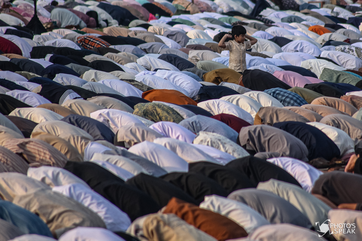 Seorang anak berdiri pada saf salat Idulfitri di Lapangan Gasibu, Kota Bandung, Rabu (10/4/2024). PHOTOSSPEAK/Ilham Ahmad Nazar